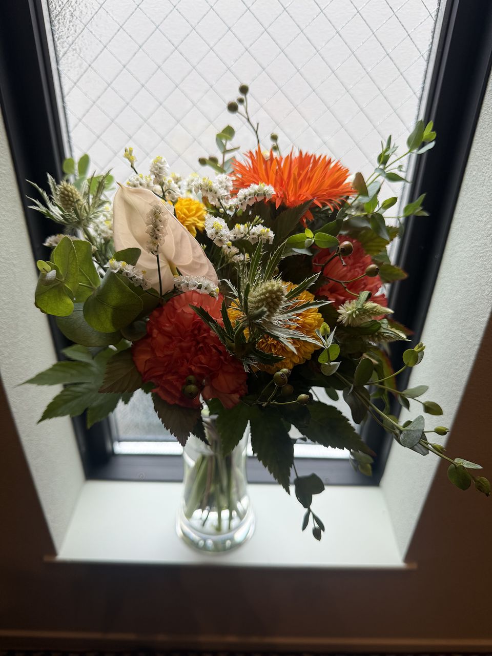 はじめボリュームが少なめかなと思いましたが、葉物の組み合わせ方やトータルのバランスが素敵でした!うちにはインスタライブとは少し違うオレンジ系がきてくれました。