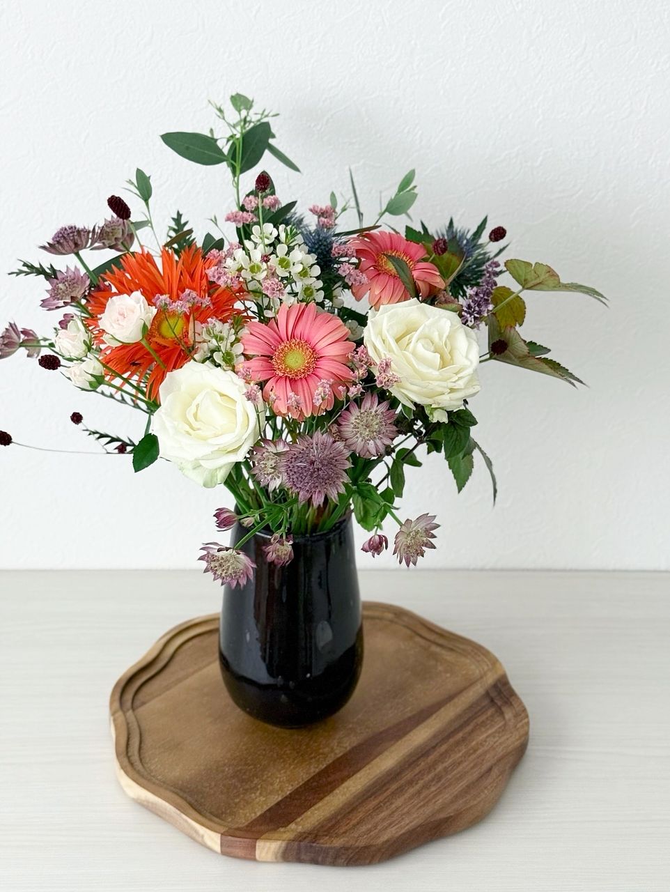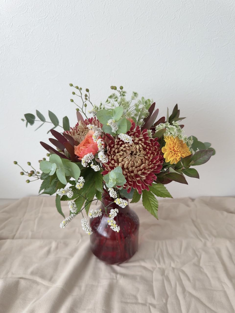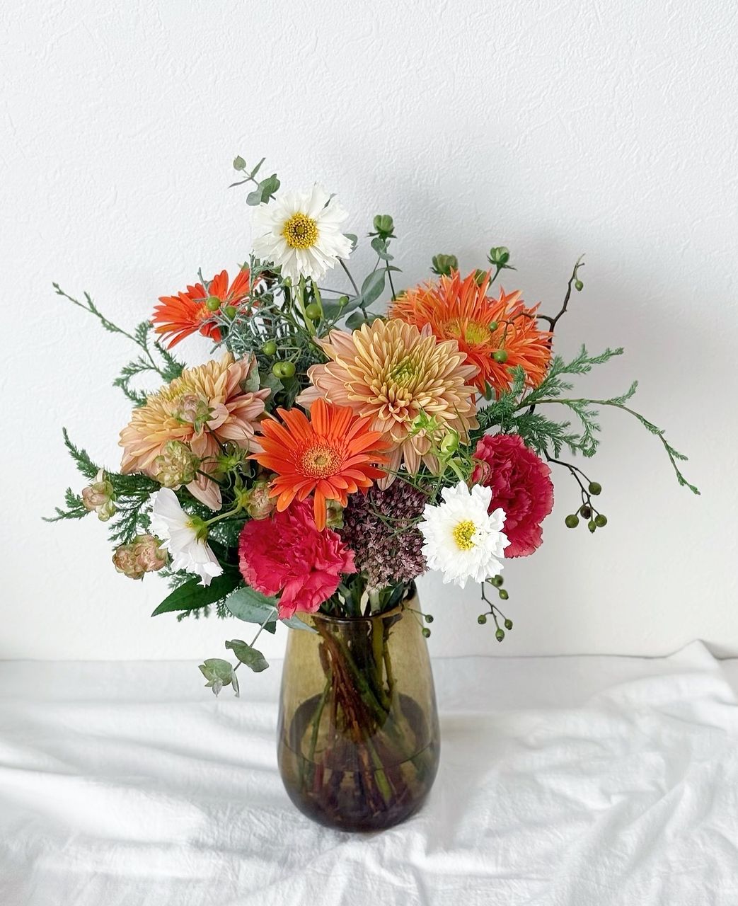 秋らしいアレンジでとても可愛い❣️そのまま花瓶へと書いてありましたが長旅なので下から3センチくらいカットして2時間くらい水揚げしました。 すこししたら麻紐解いて寄せ変えして楽しみます 素敵なお花ありがとうございました またインスタライブ楽しみにしてます。ほんとに争奪戦でし た(笑)
