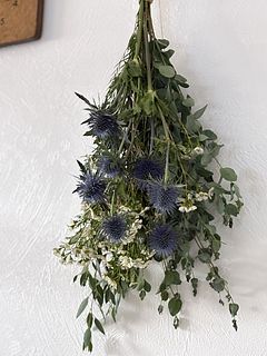 ワックスフラワーやエリンジウムを組み合わせて。ドライに向いてるお花をセレクトしています。ユーカリの香りも楽しんで! ワックスフラワーは葉っぱをこするととっても良い香り。