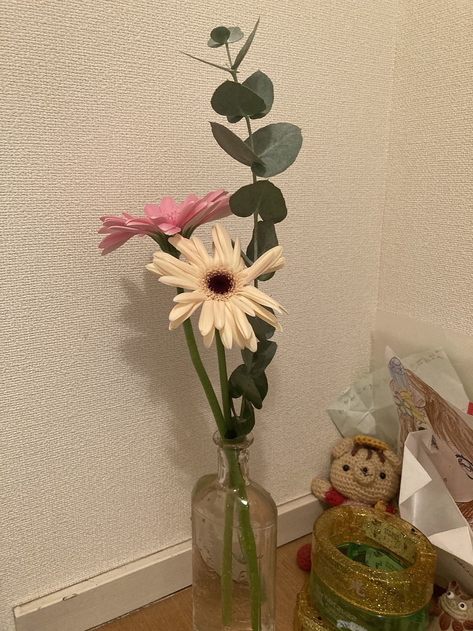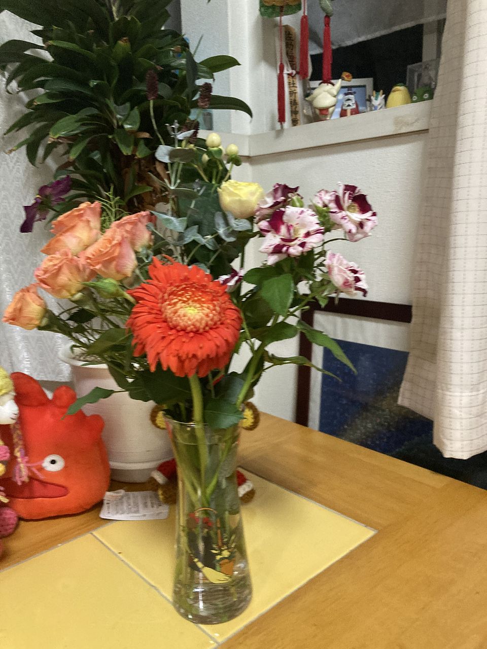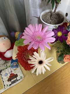 バラの花言葉は「感謝」「上品」、コスモスの花言葉は「乙女の真心」、ガーベラの花言葉は「希望」「前向き」「常に前進」「美しさ」