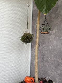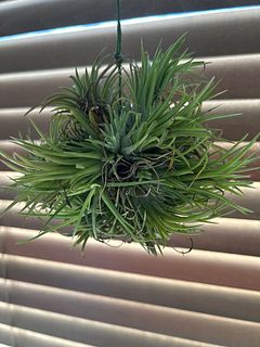 チランジアをボール状に仕上げたもの。 育てやすそうで、購入しました。 既に花が咲きかかってました! 吊るさないで、カップ状の上に置こうと思ってましたが、素敵なので吊るしてみました。 大変満足です。