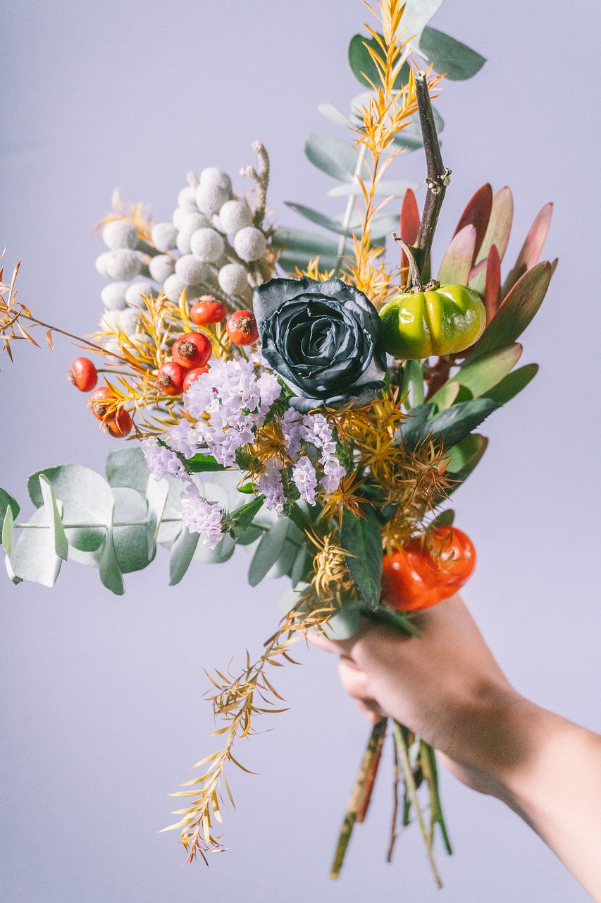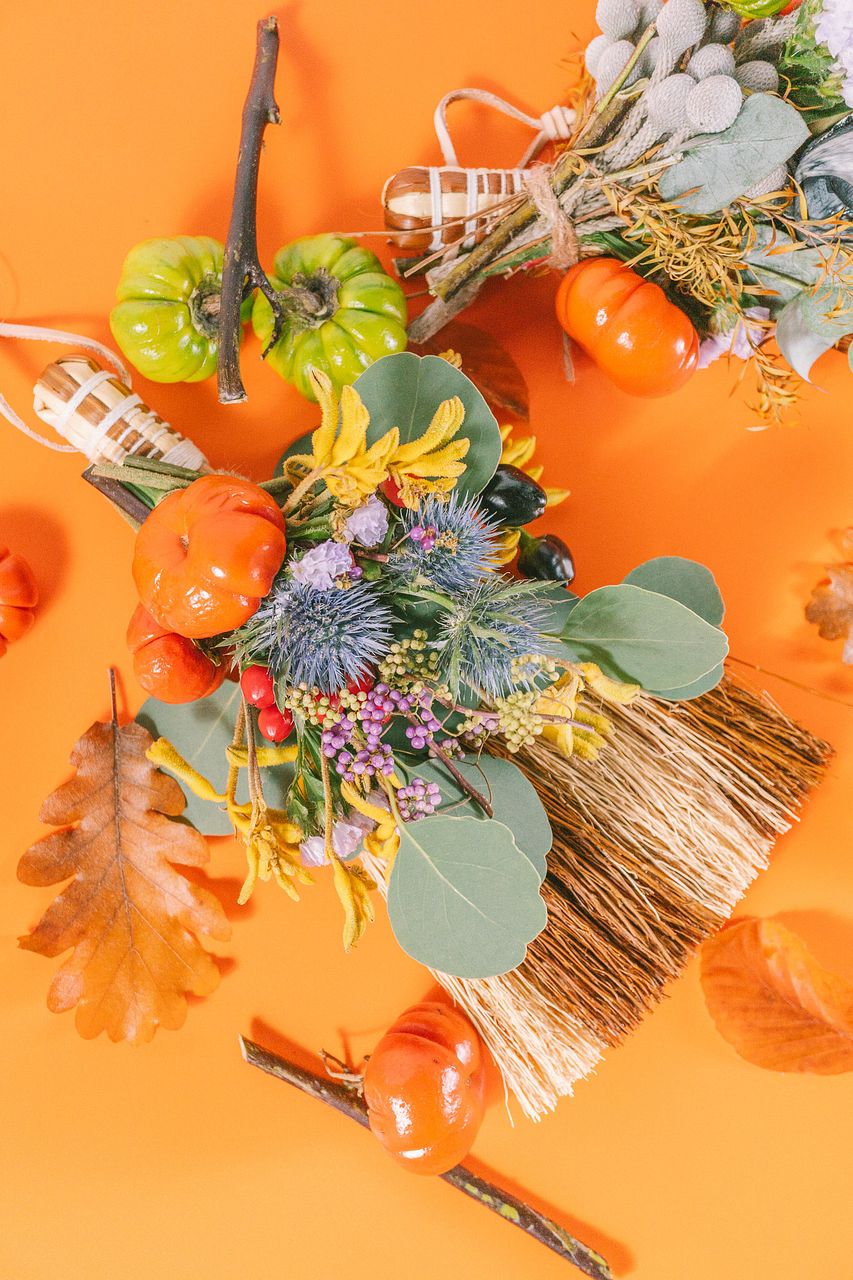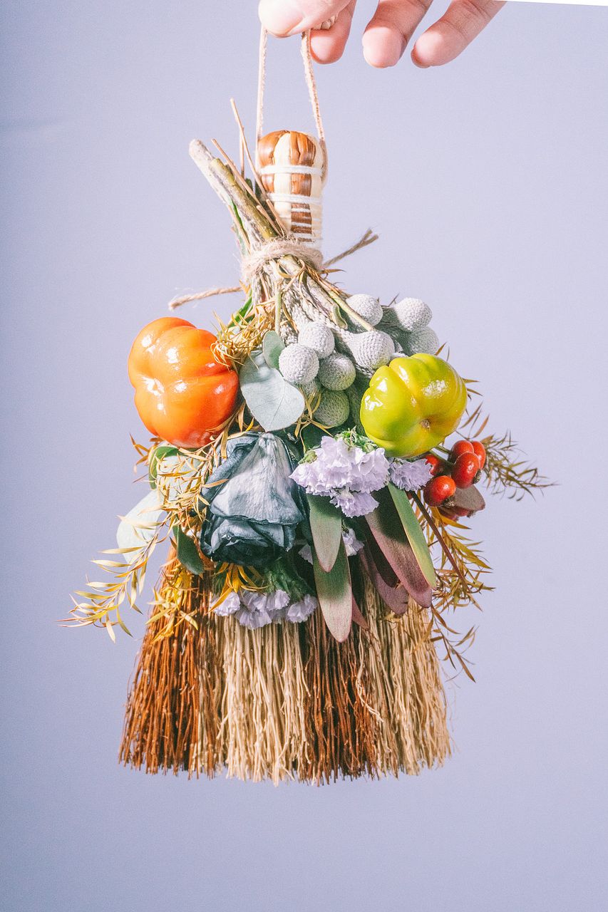 ほうきをベースに、ミニカボチャや紫の実、黄色の花材、ユーカリなどをバランスよくあしらって、見た目も香りも楽しい秋のインテリアに。