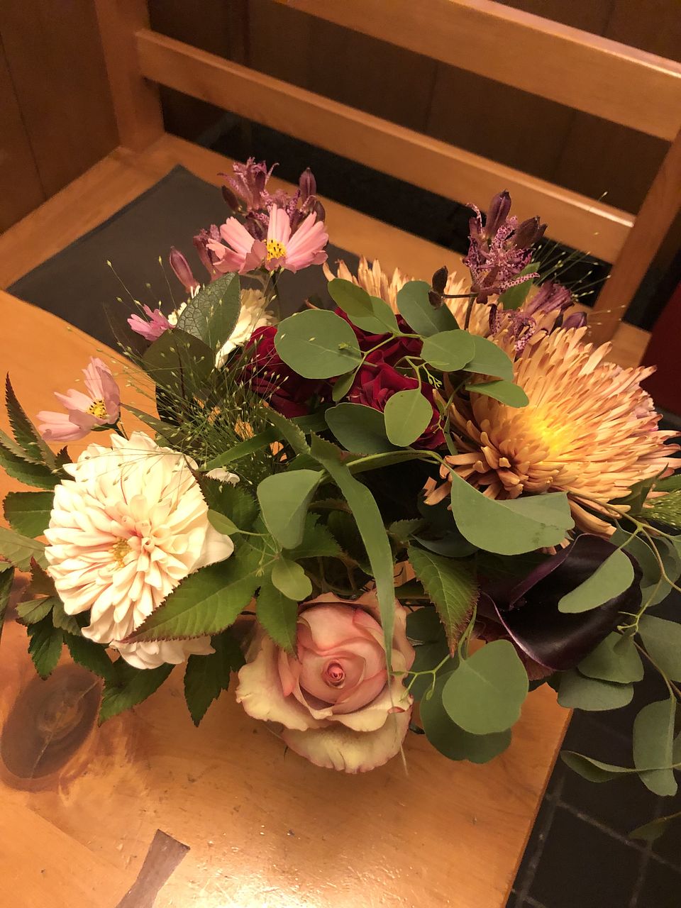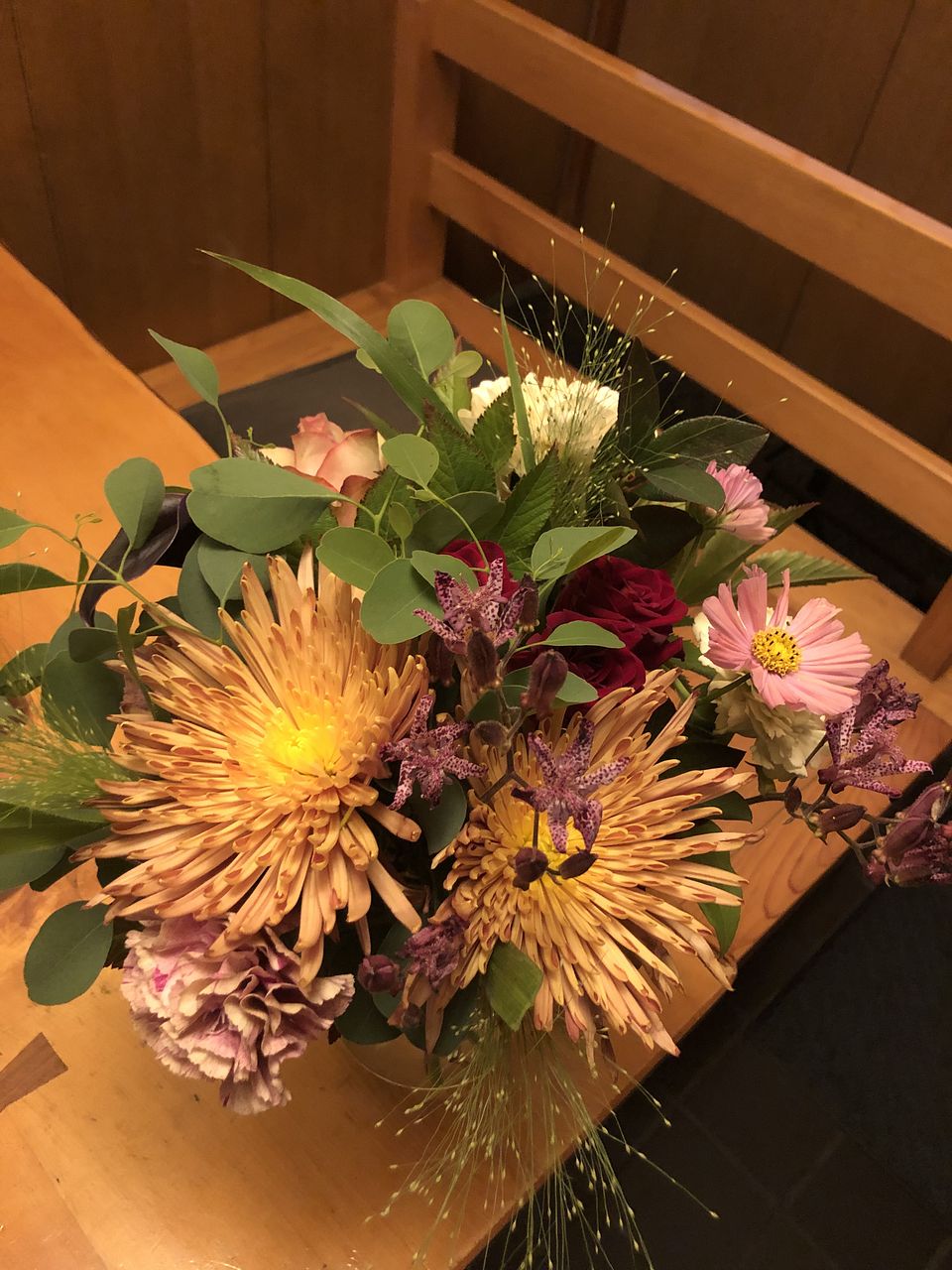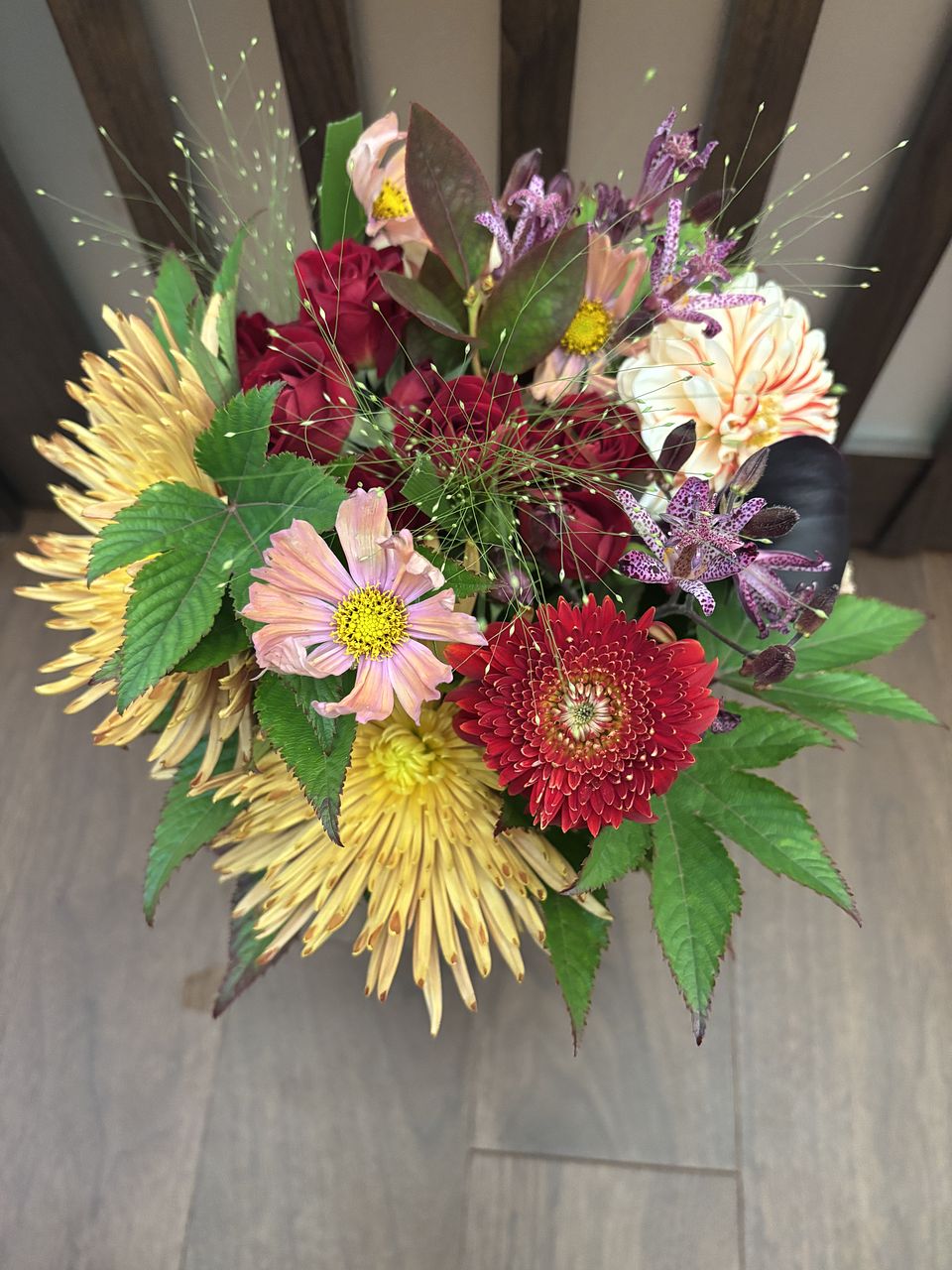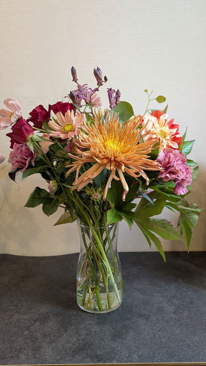とても秋らしいシックな色合いのブーケ💐 毎日向きをかえて楽しんでいます。 マムの花弁が少し傷ついてしまっていましたが 見事な咲っぷりです!