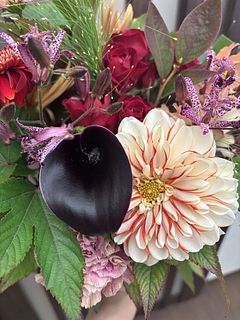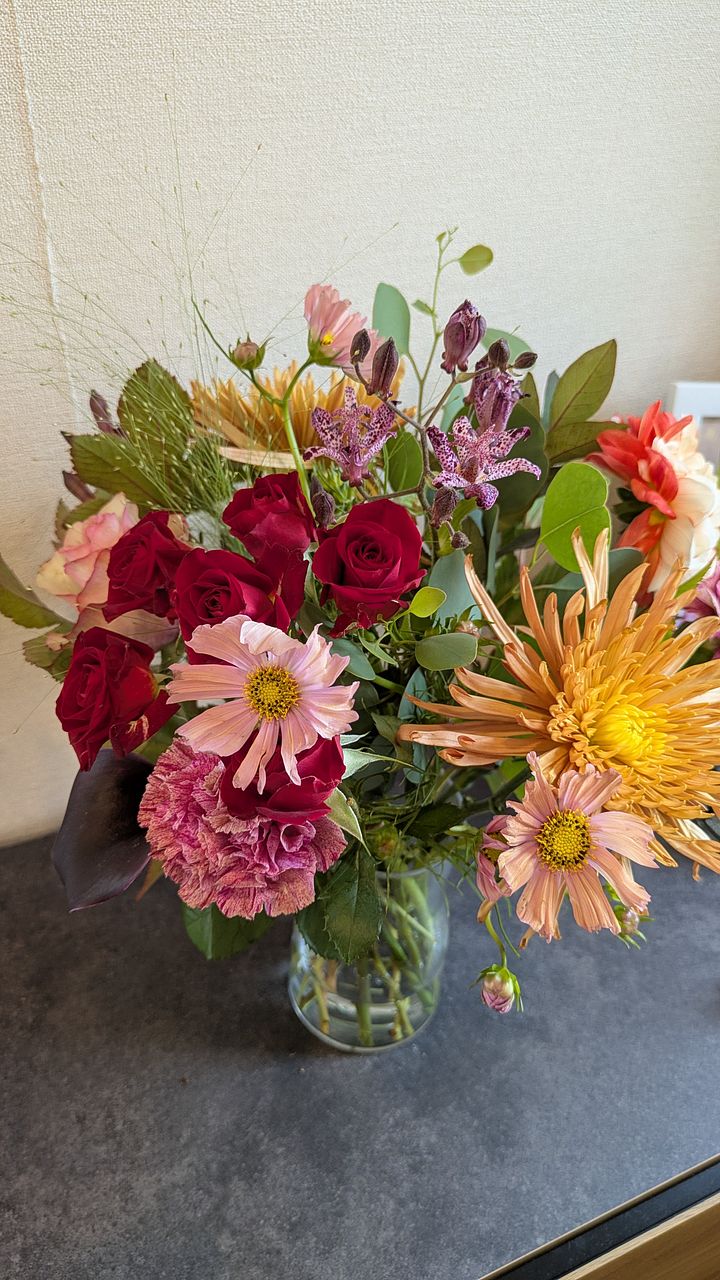 インスタライブで見て即決でした。 秋らしい色合いですが、重すぎず可愛いです。秋のバラ、コスモス、ダリア、黒のカラーまで楽しめて、自分では絶対選べない組み合わせが素敵すぎます。フローリストさんのスパイラルブーケは3回目の購入ですが、毎回ボリュームたっぷりで嬉しいです。いつも素敵なブーケをありがとうございます。