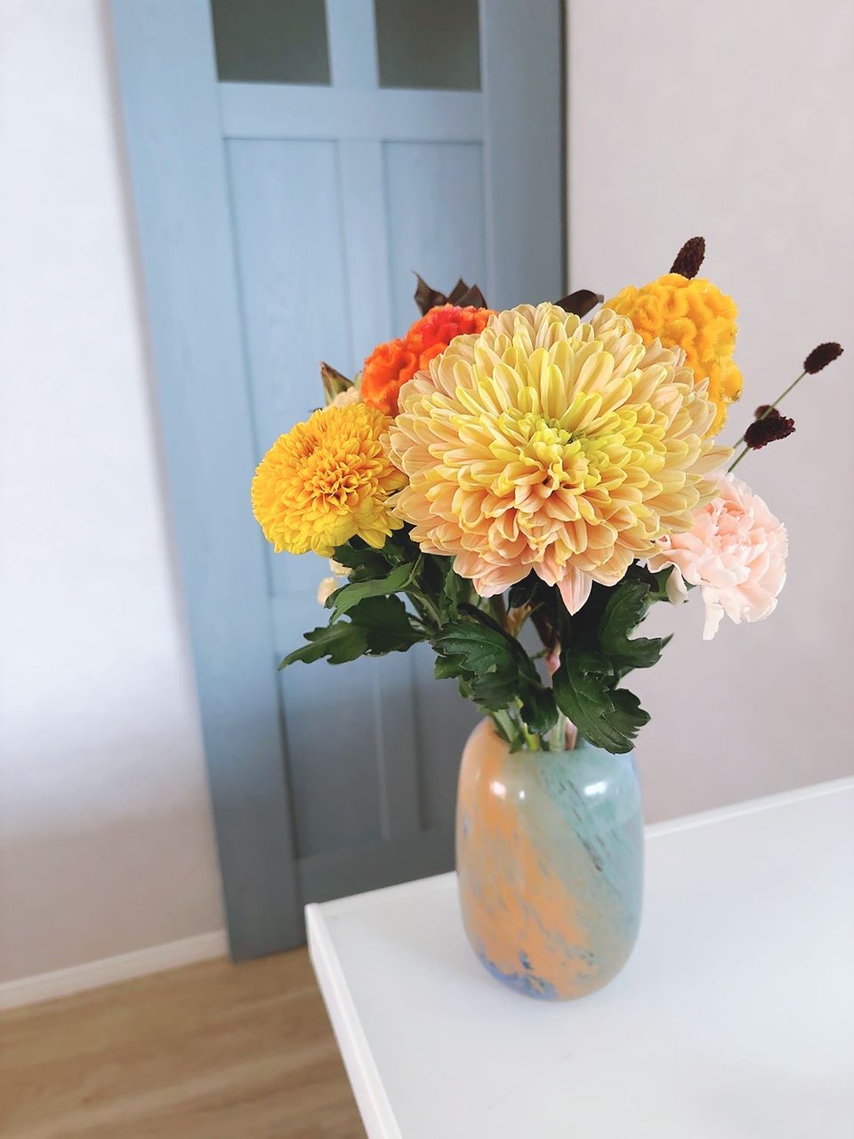 マムやケイトウなどもこもこオレンジ色のお花を中心に束ねて🧡🐑心が温かくなる組み合わせ。ブラウンの葉がアクセントです☕️