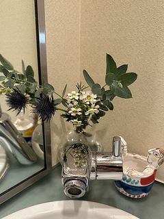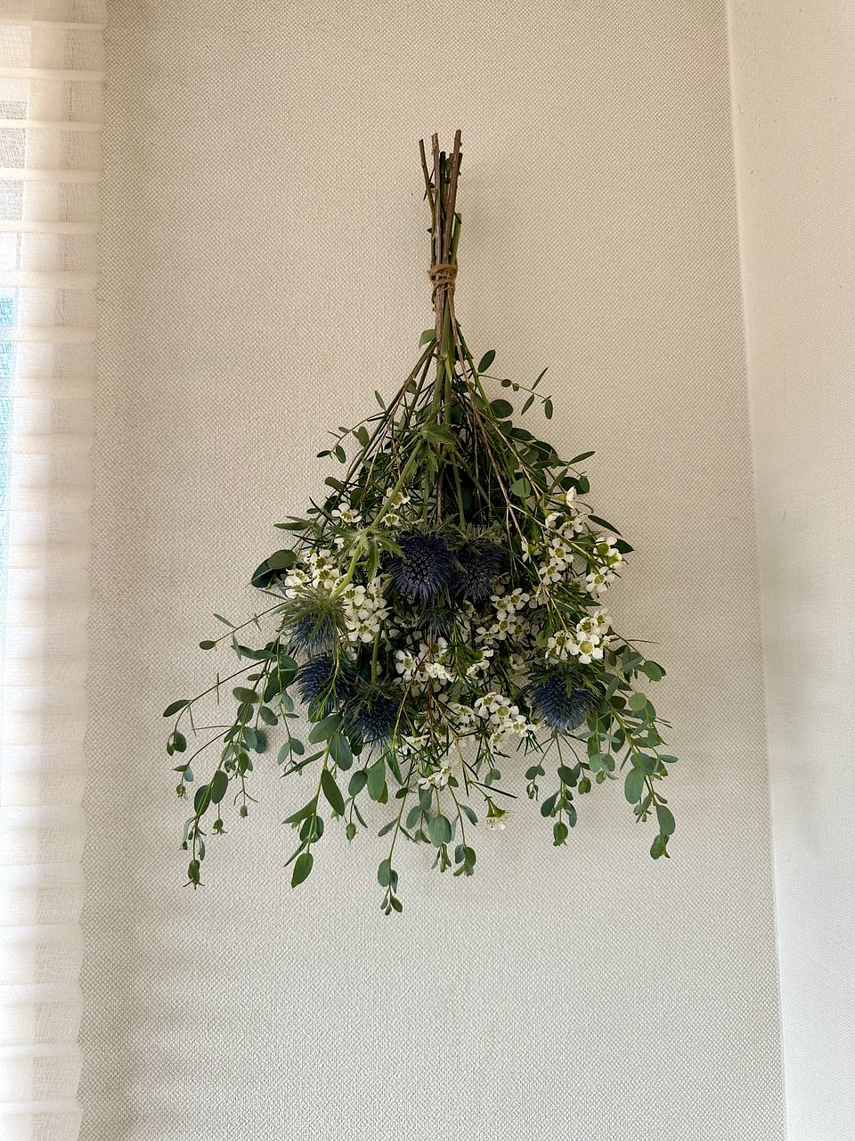 ワックスフラワーやエリンジウムを組み合わせて。ドライに向いてるお花をセレクトしています。ユーカリの香りも楽しんで! ワックスフラワーは葉っぱをこするととっても良い香り。