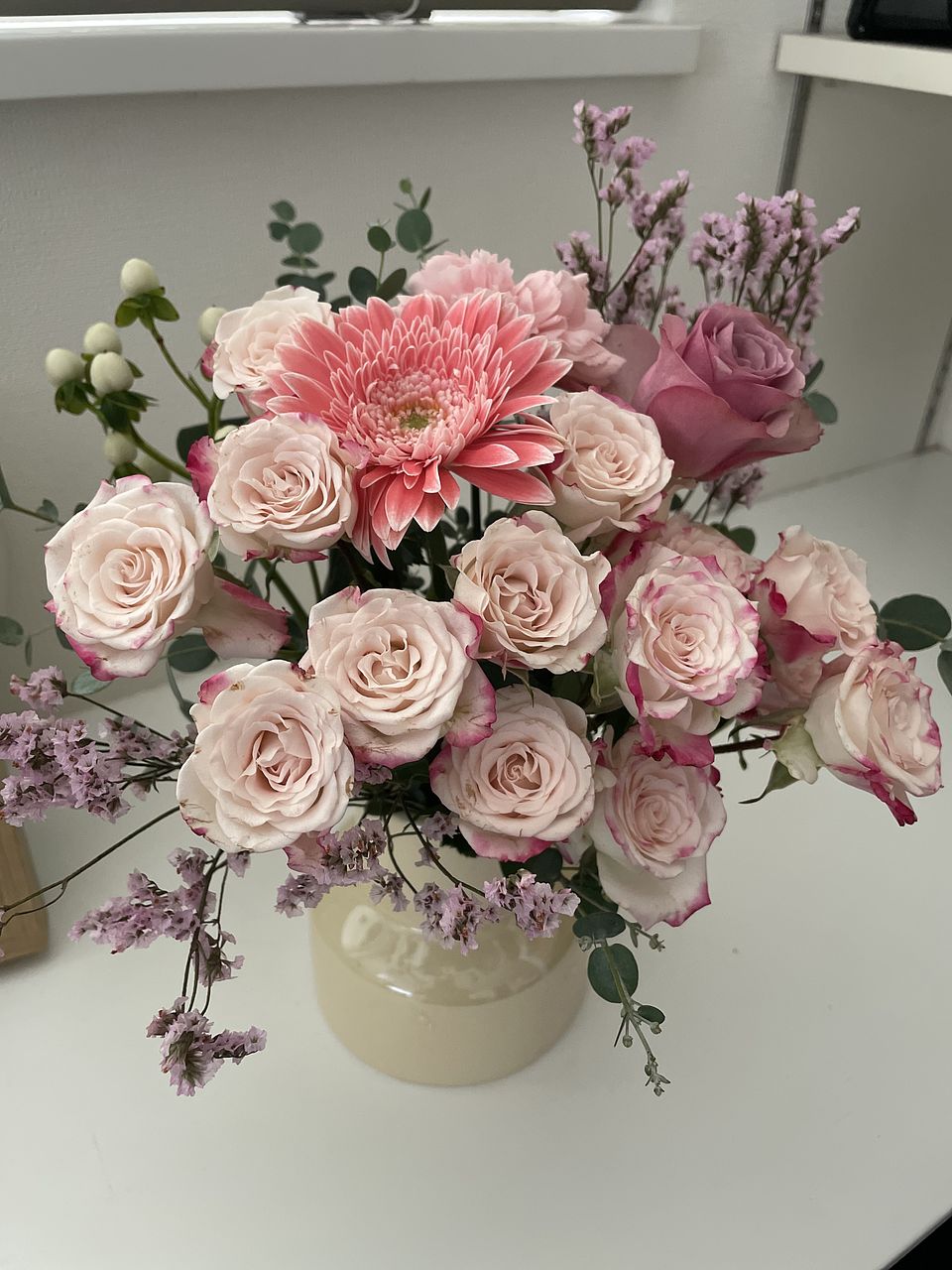 白っぽいバラは一本にたくさん花がついていてボリューミーです。ガーベラも可愛い!