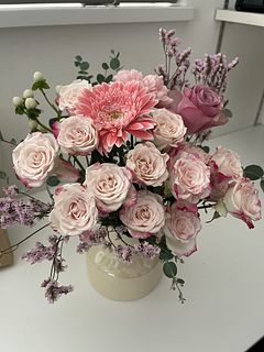 その時々で、花の色や種類が変わる可能性があることは承知の上での購入でしたが、スターチスが渋めの色で、少しイメージが違いました。(渋め紫に少し黄色)