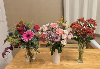 面白い組み合わせで3種類届きました。 白系はトルコキキョウの蕾がまた一つ取れていました。 赤系の紫陽花は、くすみカラーだったので、大輪の以前買った紫陽花と一緒にしました。 白系と紫系は一緒に飾っておきました。 全体的には良かったと思います。