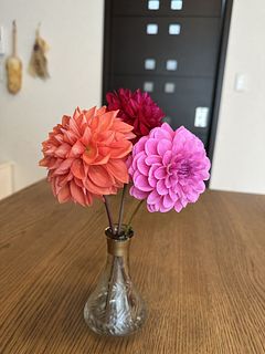 今回はダリア「エタニティシャイン」「エタニティルージュ」「オレンジストーン」などピンク・赤・オレンジのダリアを6本お届けします。エタニティシリーズは日持ちが大変優れている品種です!ぜひお試しを✨