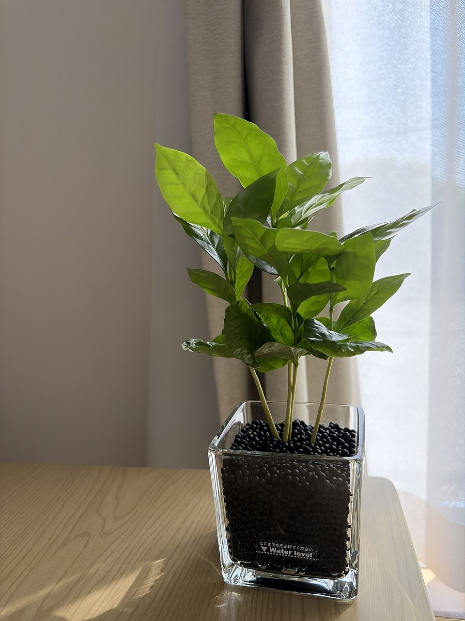 コーヒーの原料とも知られ、長く育てていると白く儚い花が咲き、その後赤い実がなります。(大きくするためには植え替えが必要です)