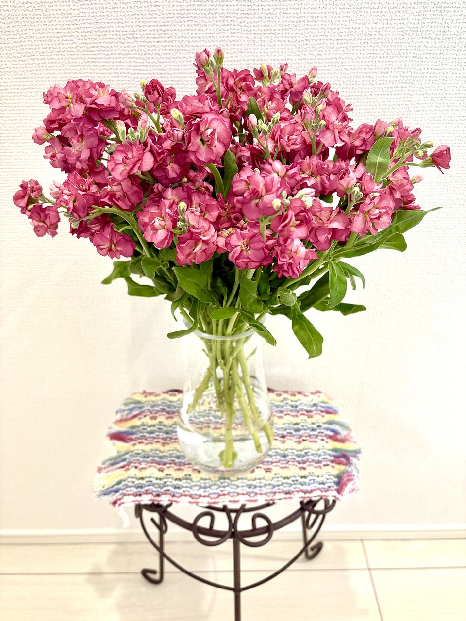 ストックの香りの成分はクローブ(丁子)のスパイシーさと、ほのかに甘いパウダリーな香りが混ざっています。ぜひ香りも楽しんでみて😉