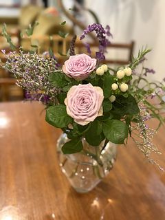 リラックス効果があるとされるアメジストセージを主役に豊かな香りのハーブやユーカリを合わせました。ラベンダーカラーのバラがチャームポイント💜