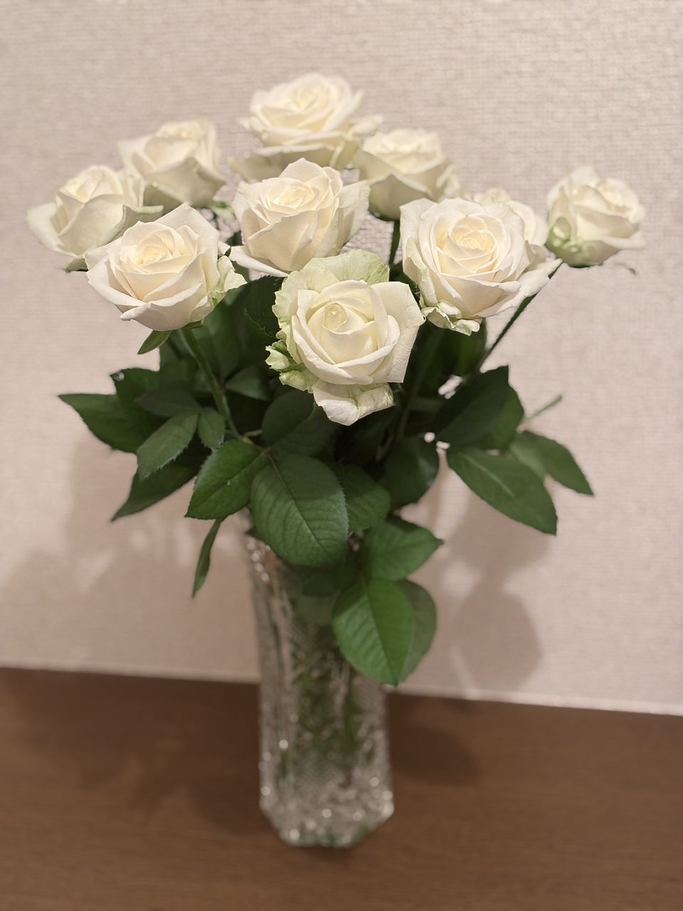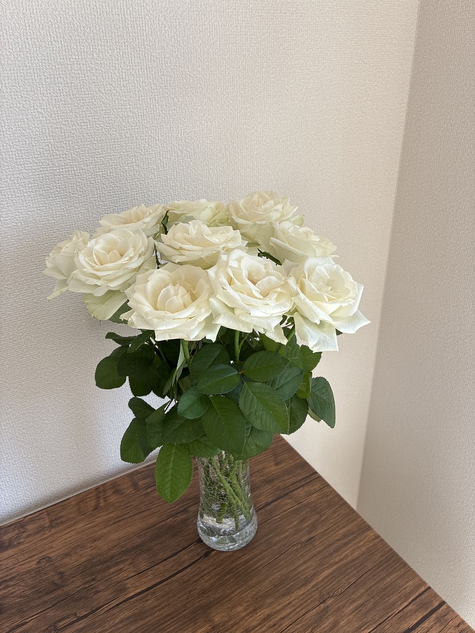 新鮮な白バラが届きました。 バラは水揚げが難しいので心配でしたが、10本ともふんわり優しく広がっています。お部屋がぐんとエレガントになって朝の紅茶が美味しく感じます。 スタッフさん有難うございました💕