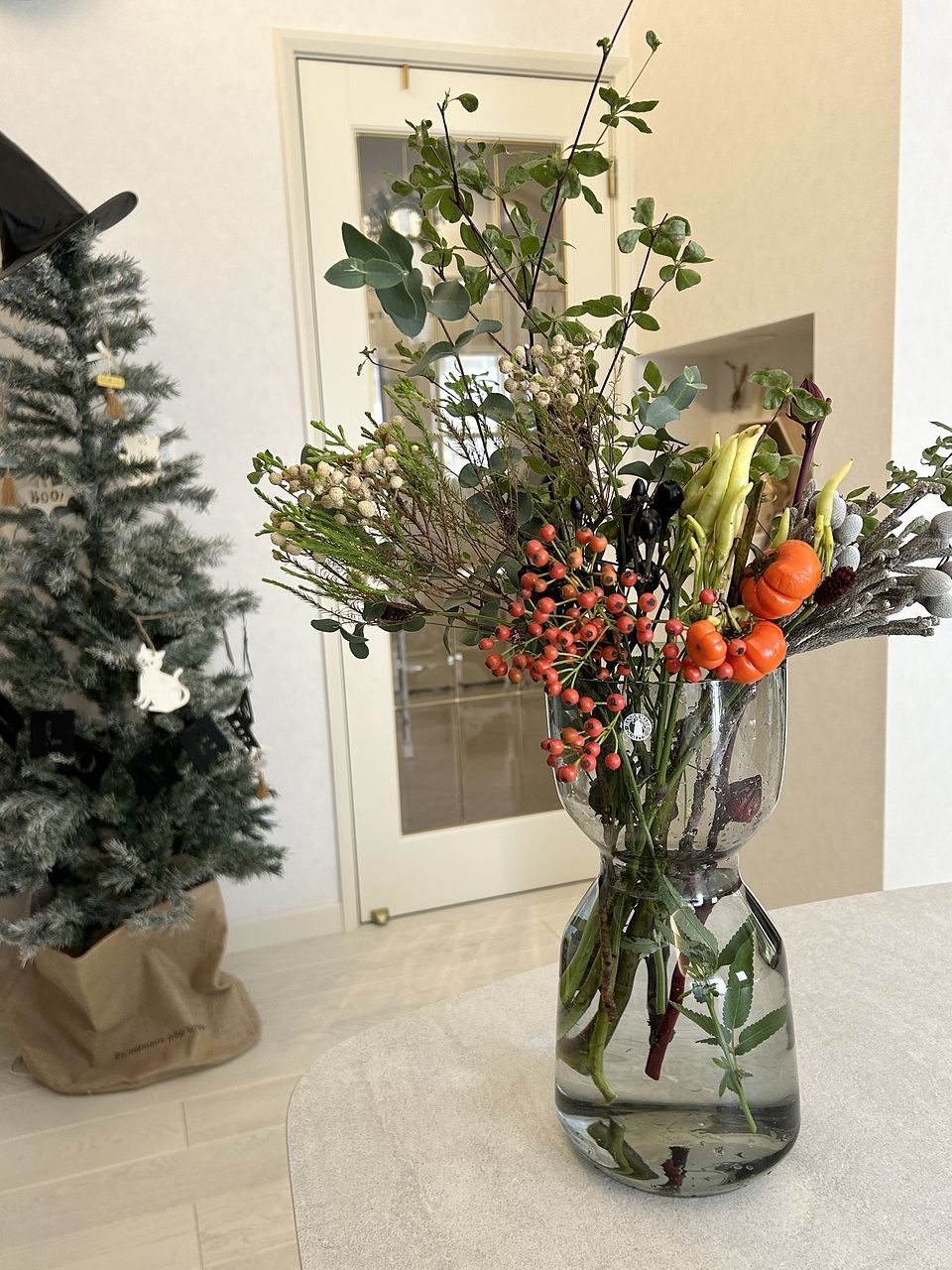 カーネーションの色がくすみ系でとても可愛かったです!秋の実は秋の雰囲気がでていてとても気に入りました!
