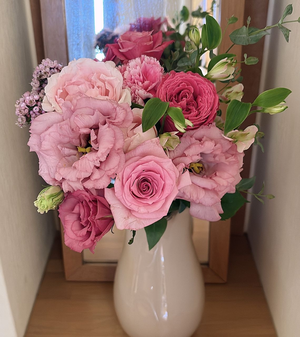 とてもボリュームがあり、玄関が華やかになりました。 帰宅のたびに気持ちが上がります🥰⤴️ わが町の小さな花屋だとどうしても種類が限られますがこちらは葉ものも花も数種類混ざっていたのでよかったです💖 冷蔵庫で保管された花はすぐ咲いて終わる感じでしたがこちらのは新鮮なので持ちも良かったです。 また利用したいと思います。