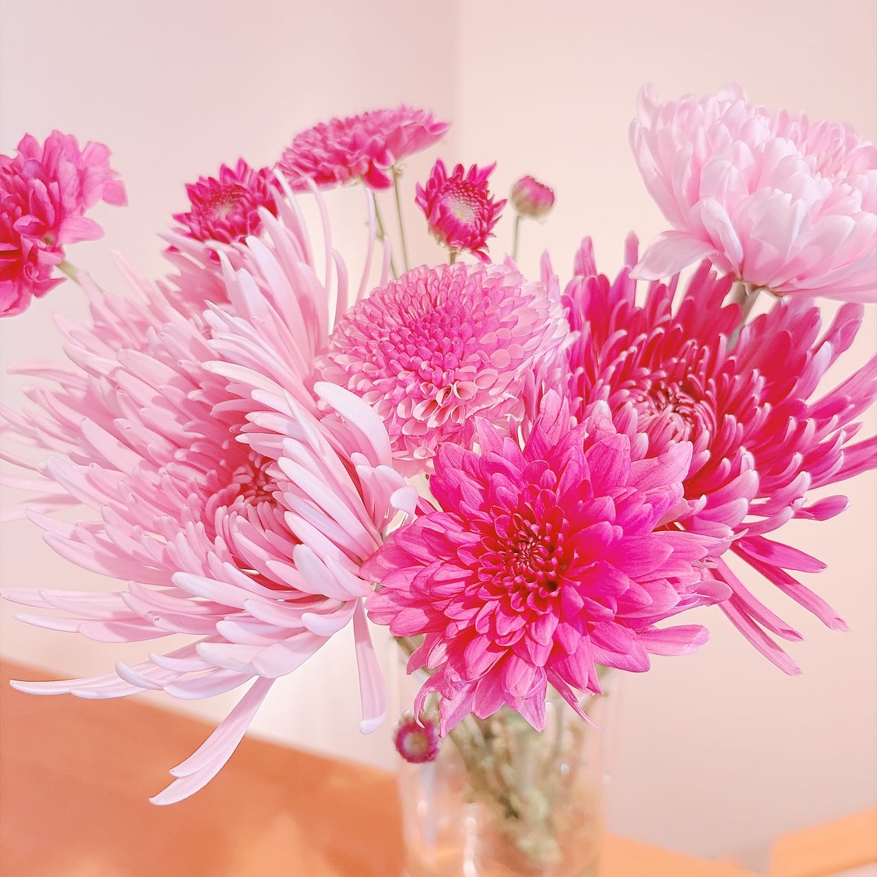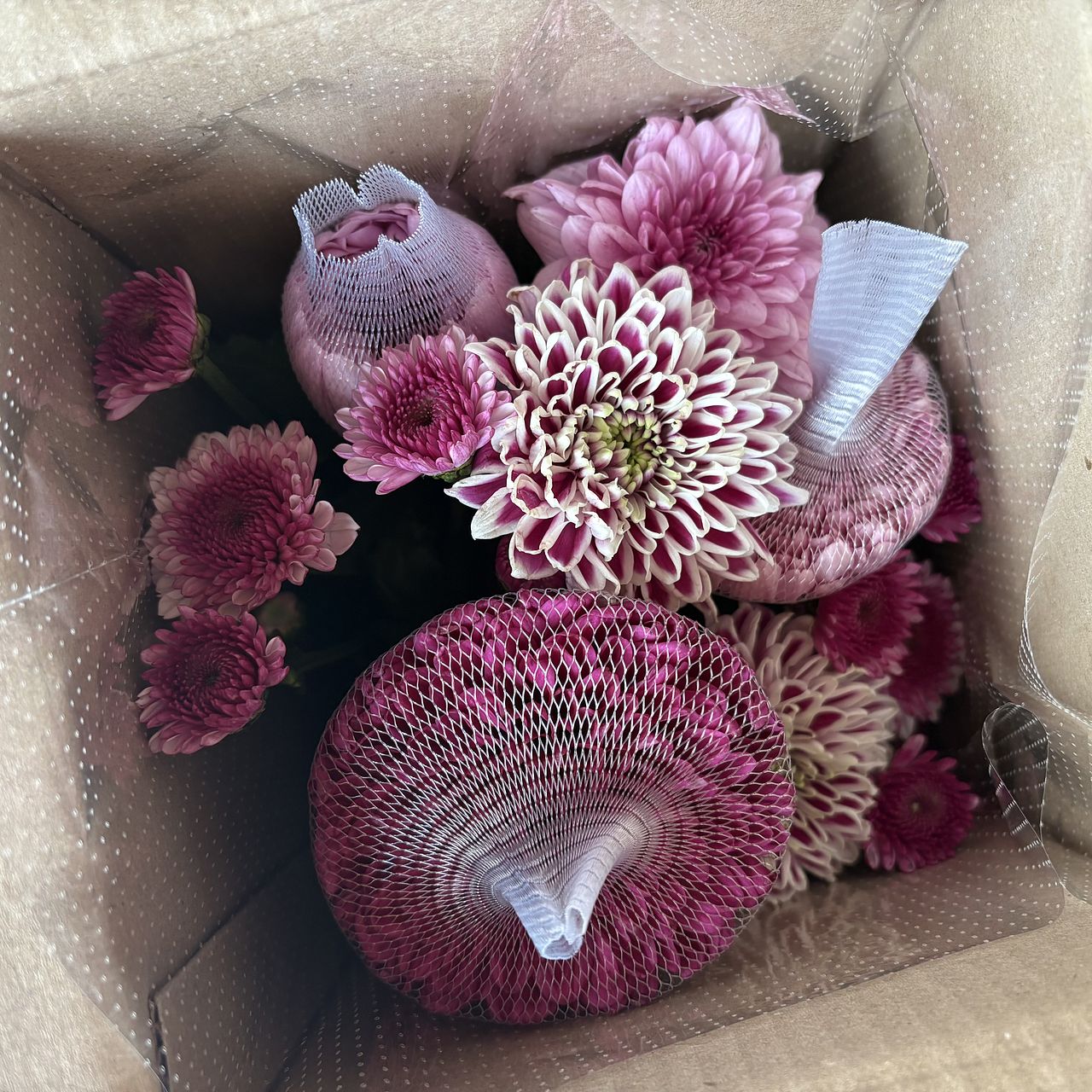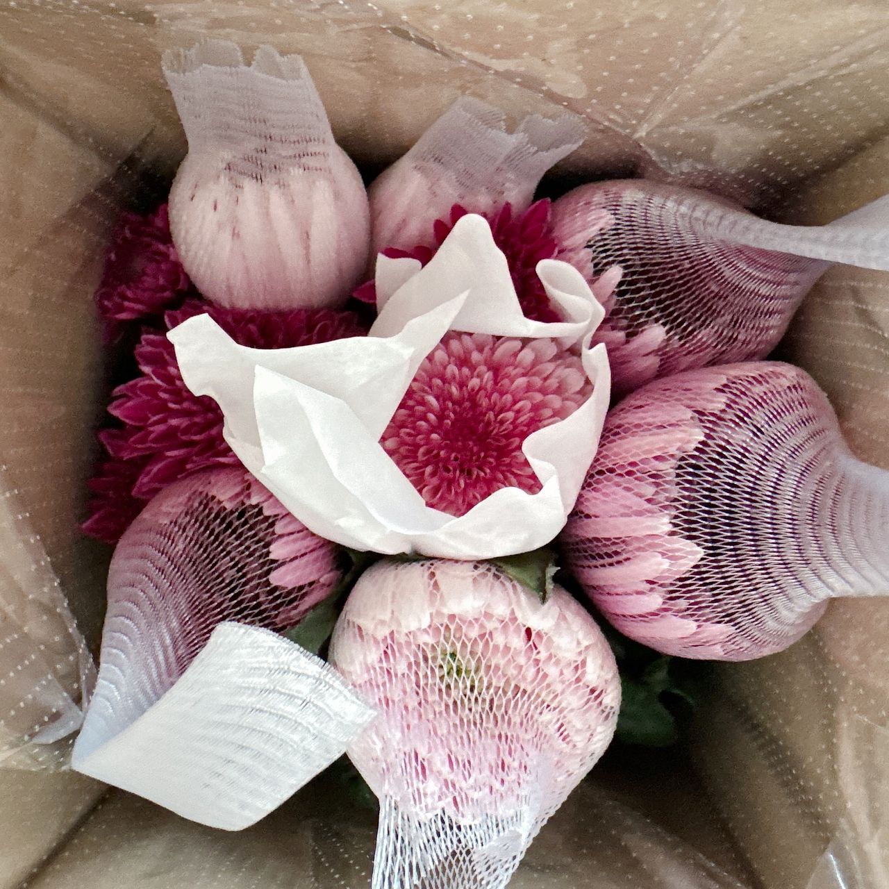 丁寧に梱包された、素敵なマムが届きました🩷 8本とも鮮度良く、大輪で色のバランスも良く、何より可愛い! マムがさらに好きになりました😊