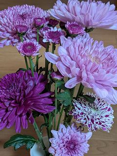 ステキなマムが届きました!私が受け取った花は落ち着いた色合いでしたが濃淡、大小とり混ぜて華やかです。注文して本当に良かったです。 お盆に間に合わせていただきありがとうございました。