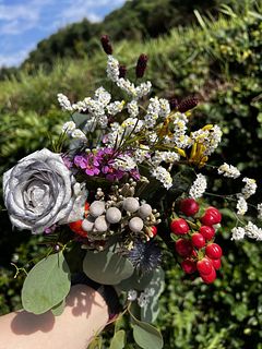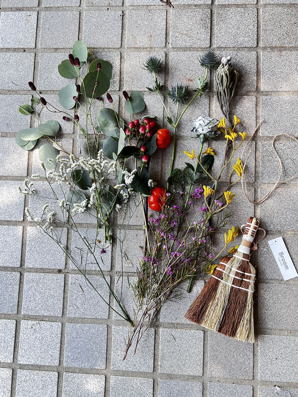 箒よりかなり大きな花束がついていて、スワッグにする分と花びんにいける分がとれました。 ソラナムパンプキンは水分が多そうなのでうまくドライになるか少し心配です。