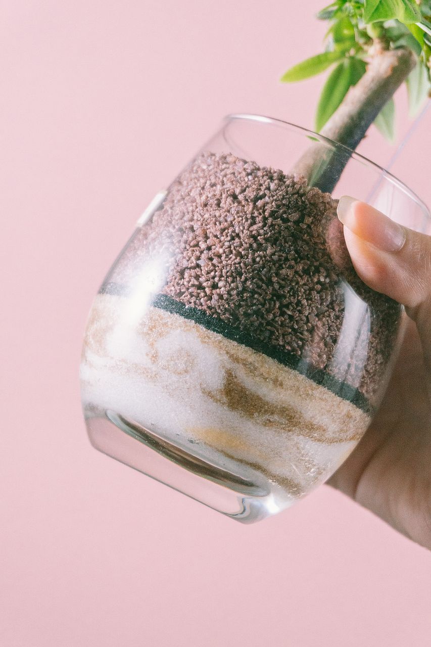 まるでデザートのような見た目が可愛い、カフェモカカラーのカラーサンドに植えられたパキラ🌴