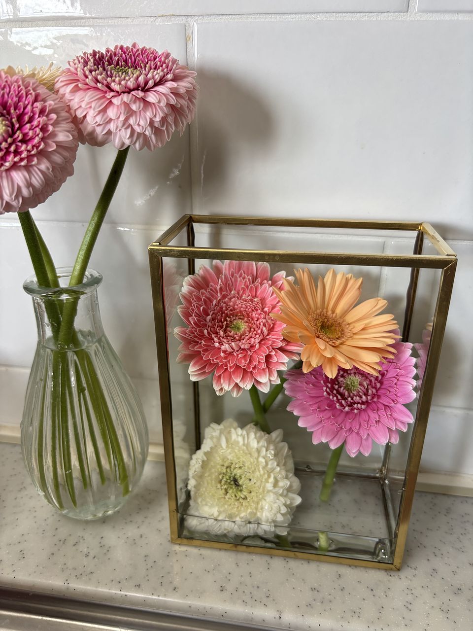 アプリコットピンクやコーラルピンク、ホワイトピンクなどニュアンスカラーのガーベラをギュッと束ねました🍑ころんとした咲き方が最高にキュート🥰