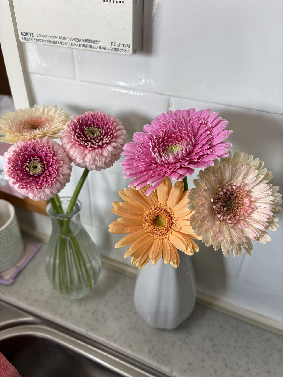 ガーベラは茎が曲がっている場合も。個体差のため、品質には問題ありません。水揚げ時に紙などできゅっと上を向くように巻いてみてください
