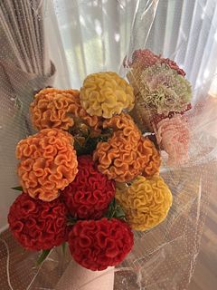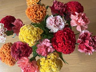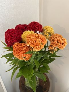 カーネーションもケイトウも暖色系で秋気分 ケイトウはボリュームあります。 とても可愛い 購入して良かったです。