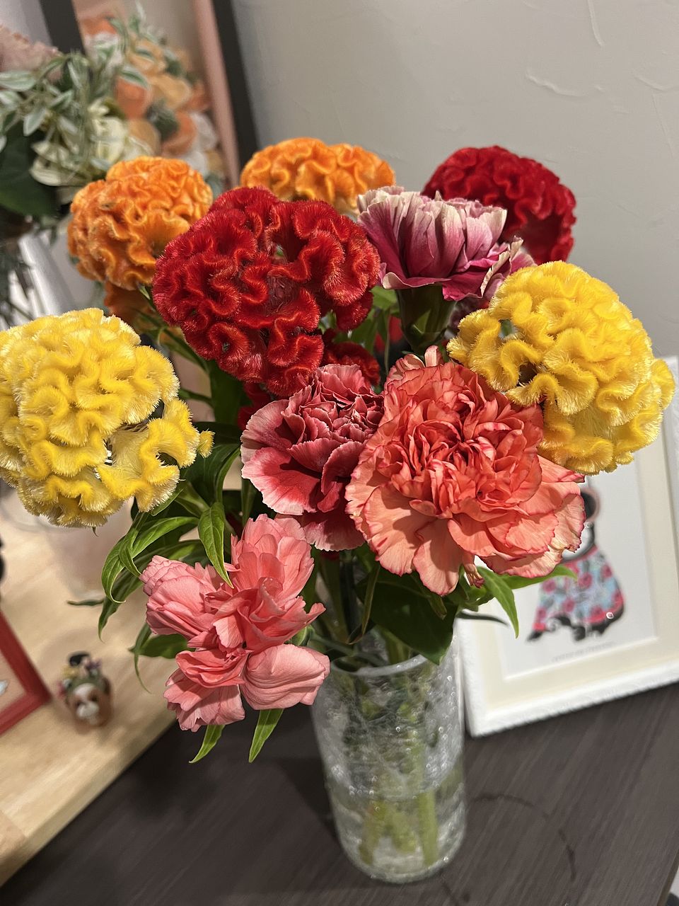 すごく新鮮な状態で届きました💐ケイトウもカーネーションも大好きなカラーで部屋が明るくなります!