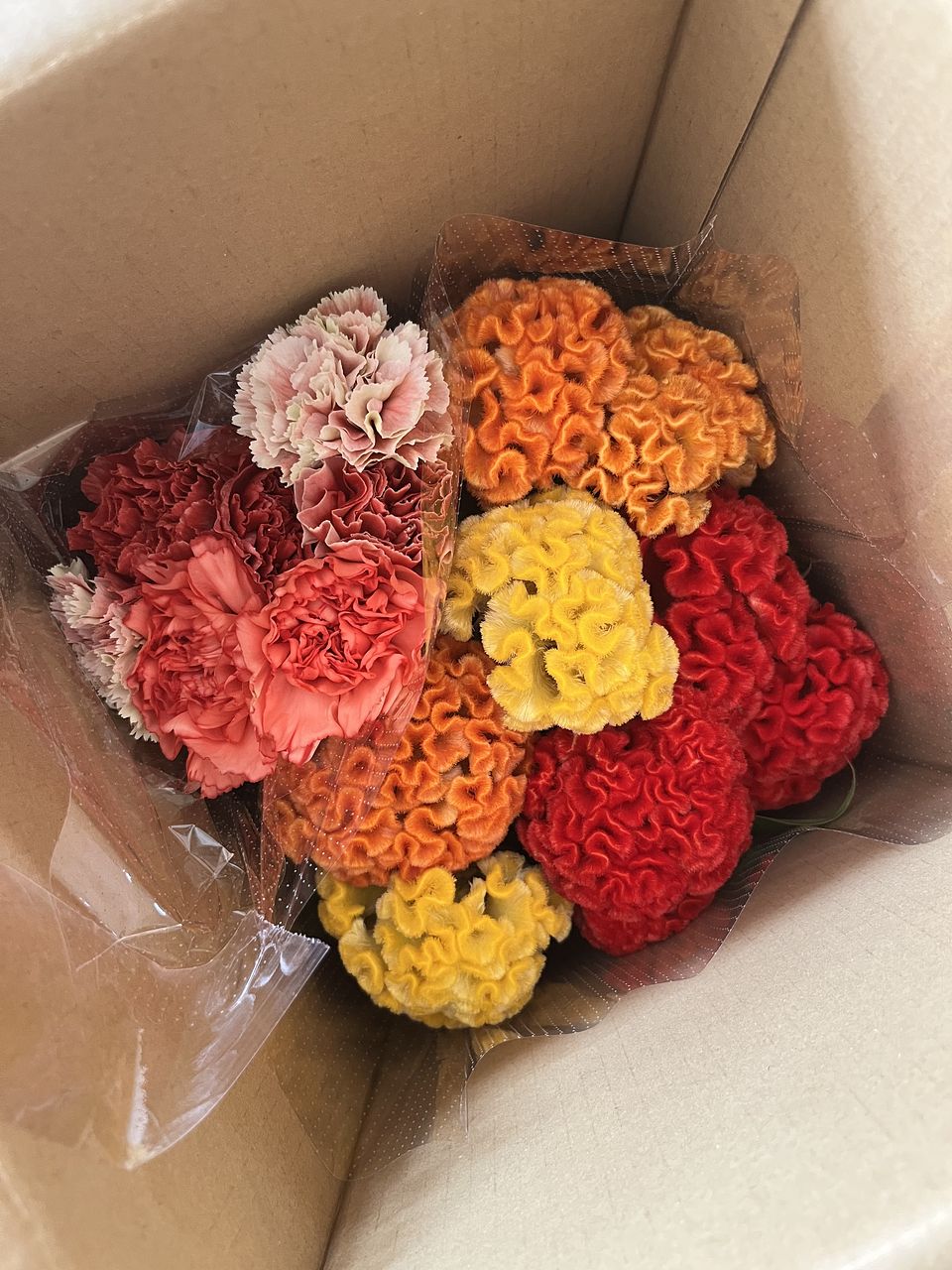 とっても可愛いケイトウとカーネションが届きました!!ボリュームもあり、オータムカラーでオシャレです🧡🤎💛