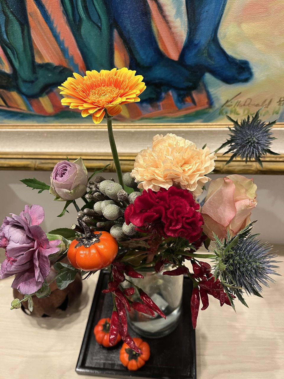 深い赤やオレンジ、パープルの花々が重なり合い、まるで魔法をかけたようにお部屋が華やかに✨