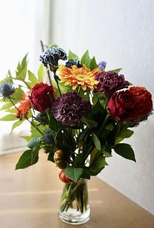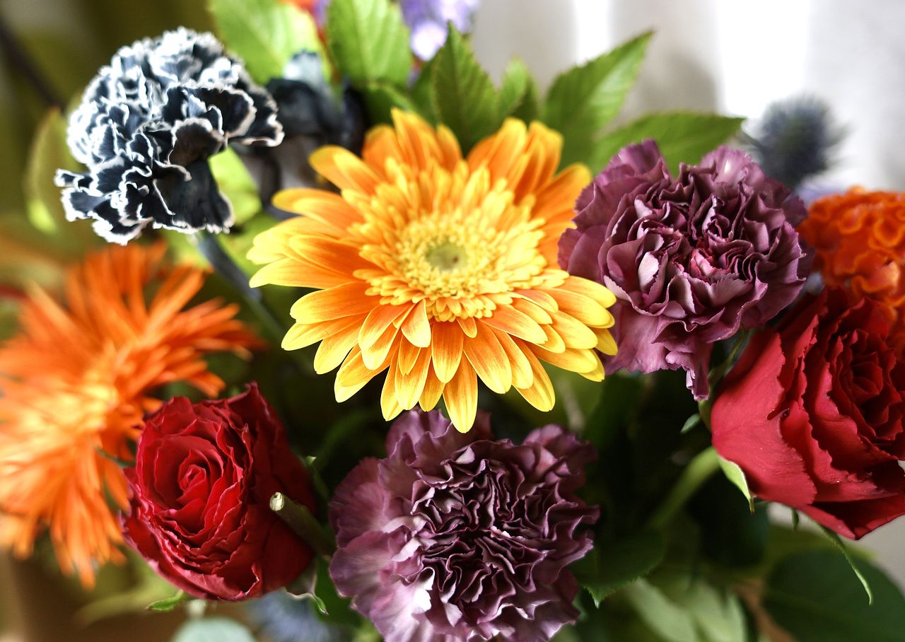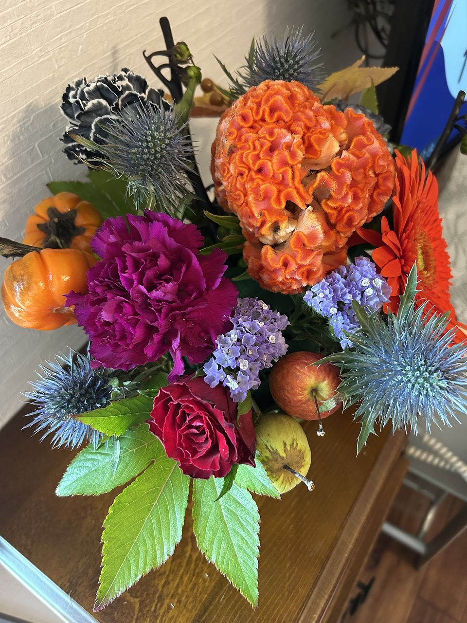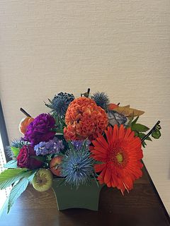 初めての購入です。ハロウィンらしい色合いで、自分ではなかなか選べない組み合わせで素敵でした。ミニカボチャもかわいい♡萎れたりすることなく鮮度も申し分ない状態で届きました。季節感が出て部屋が華やぎました。