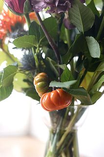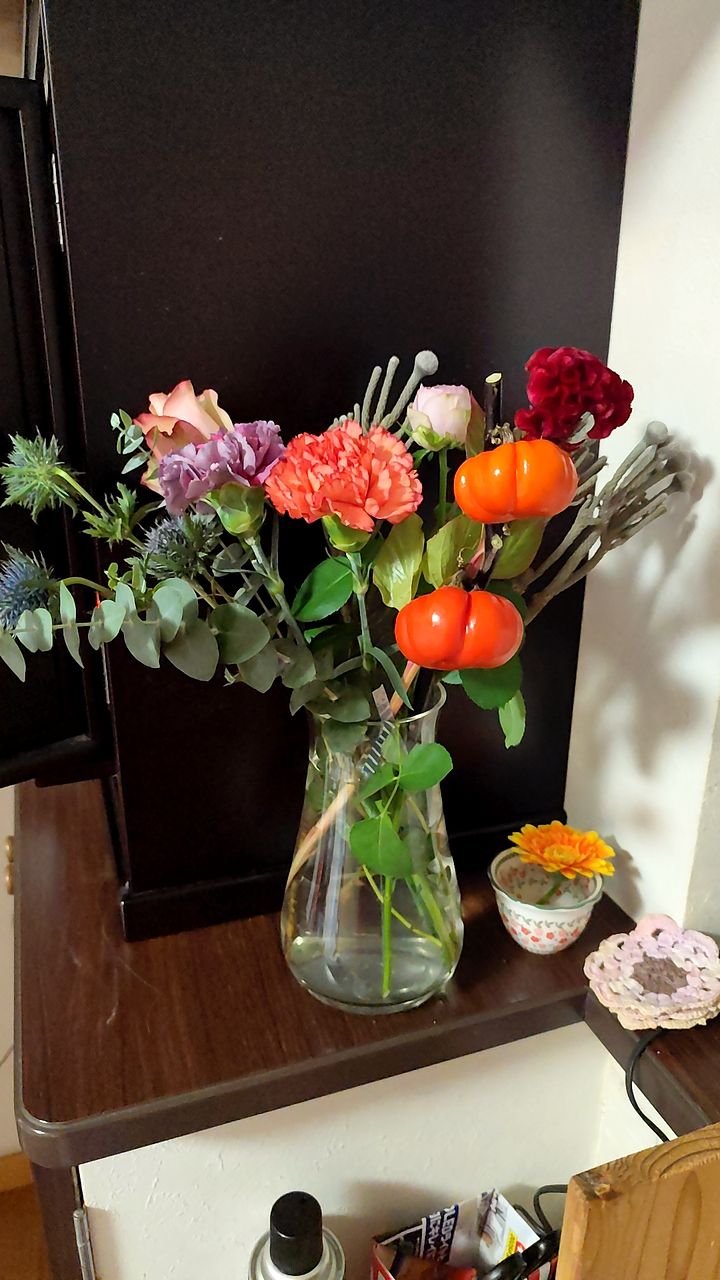カラフルな秋色ブーケで可愛い! パンプキンツリー?の実が重過ぎて枝が剥け折れていましたが、ゴムでとめて様子を見ています。