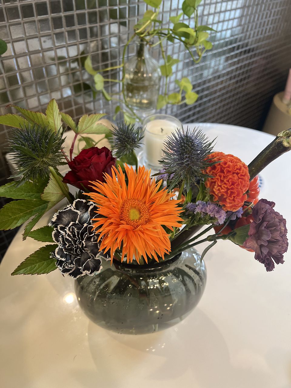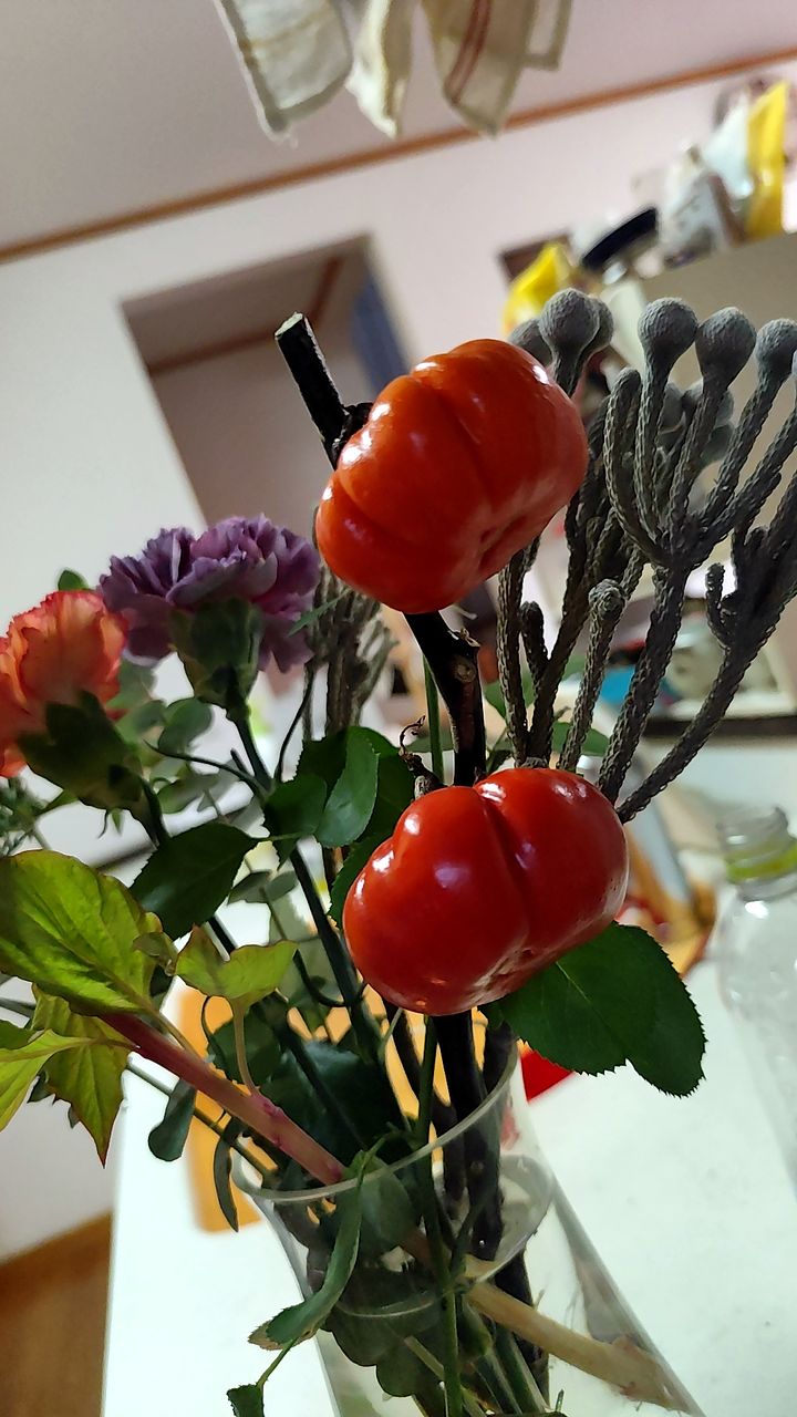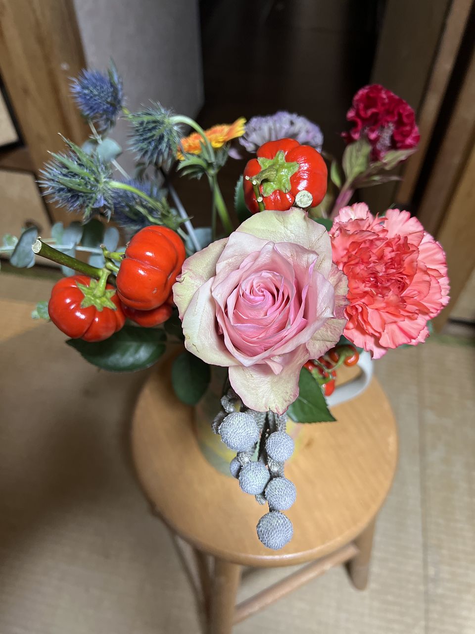 薔薇やカーネーションにハロウィン🎃カラーを取り入れていて可愛い. 家にあった赤い唐辛子も足してみたらますますハロウィン気分になりました😄