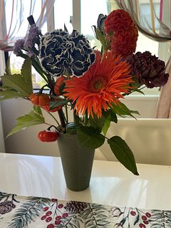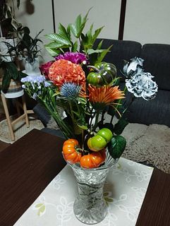 ガーベラがボリュームがあり驚きました✨ かぼちゃ🎃が1個折れてましたが沢山かぼちゃもあり花瓶で生けるか迷いましたがフラワーアレンジメントで生けました♪ とても良かったです💐