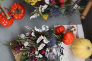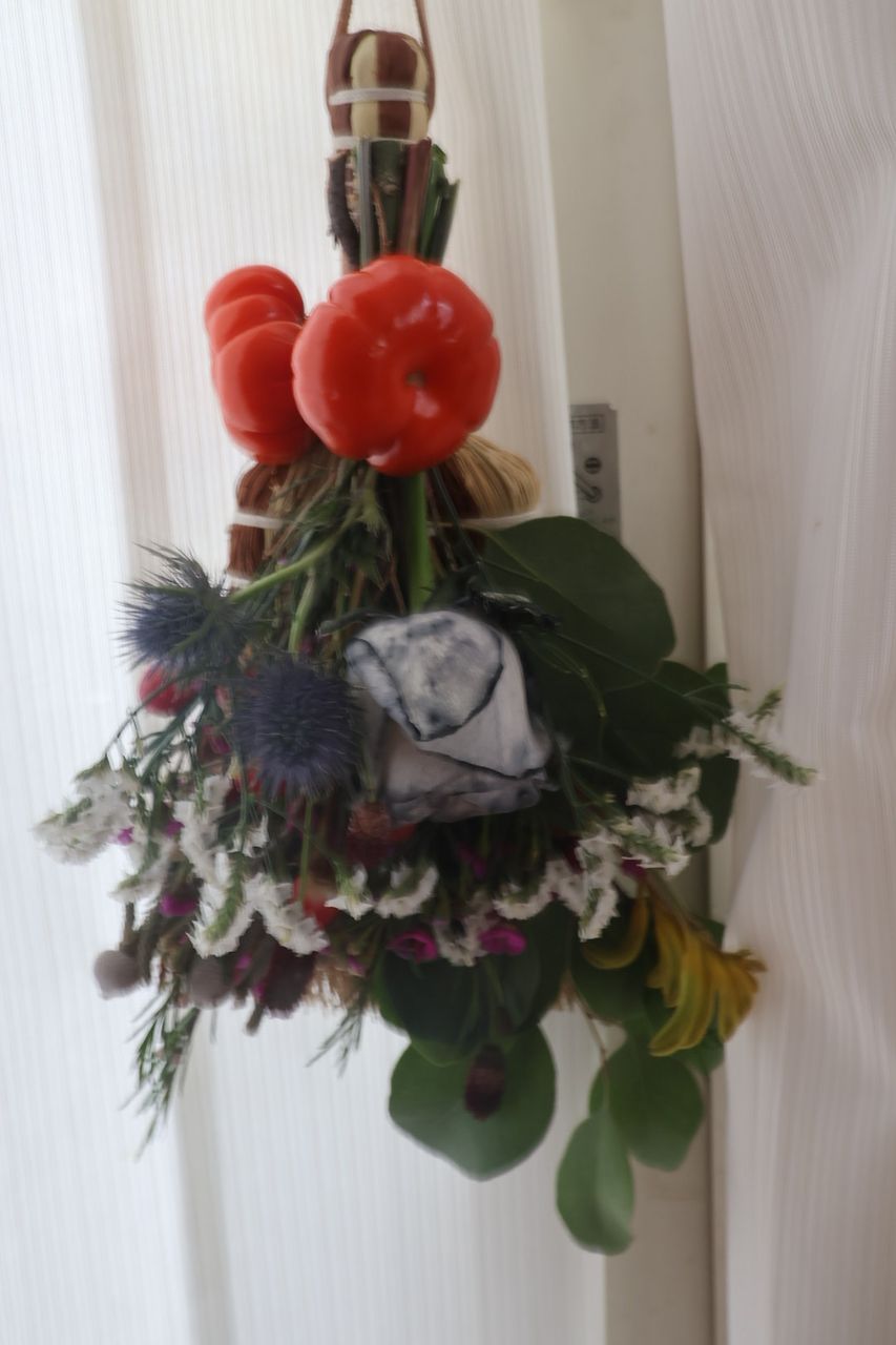 箒よりかなり大きな花束がついていて、スワッグにする分と花びんにいける分がとれました。 ソラナムパンプキンは水分が多そうなのでうまくドライになるか少し心配です。