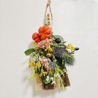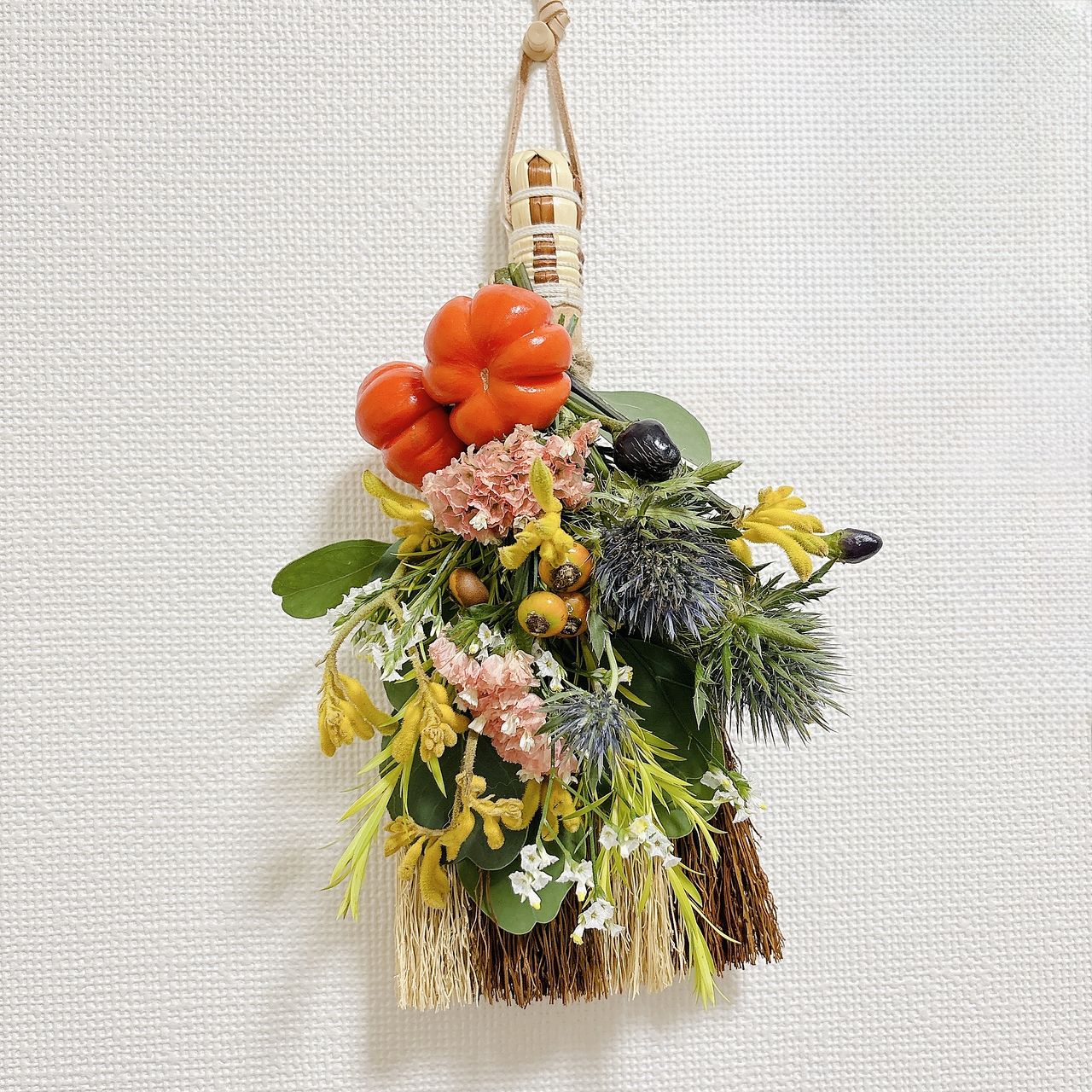 カボチャと箒の組み合わせがかわいい!と思い購入しました。お花の状態も良く、スワッグも素敵に仕上がり満足です!色の変化を楽しみに、秋冬一緒に過ごそうと思います。