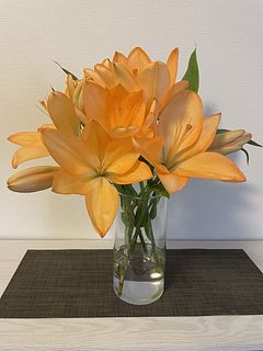 蕾で届き、5日目でほぼ満開です。 思いのほかボリュームがあり、色も鮮やかでとても綺麗です。 写真は3本に、先日届いたグリーンを少し合わせて。