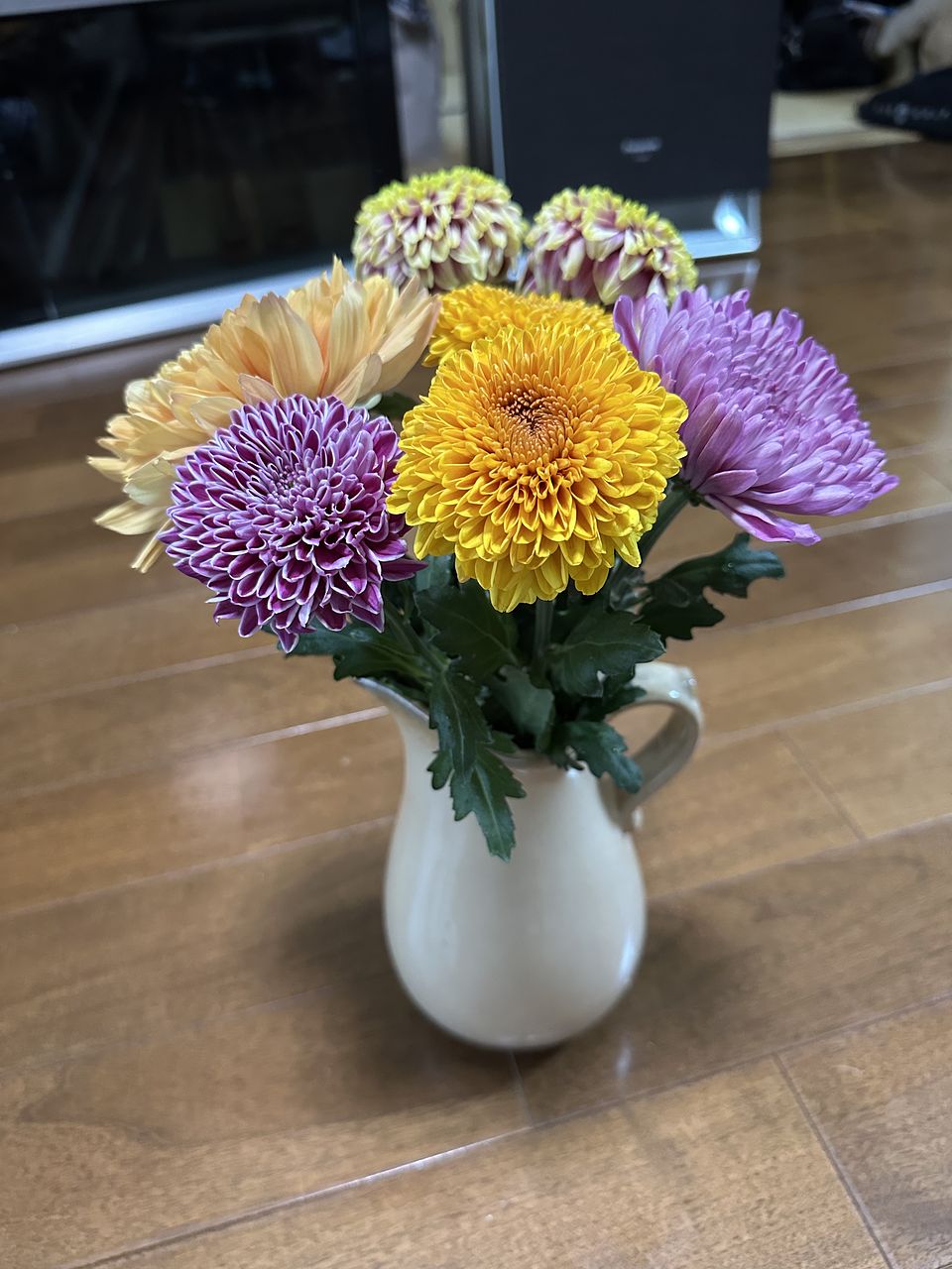 長持ちするマム、大好きです。茎を切り戻しながら、短くなったら小さなグラスに飾って楽しんでいます。カラフルな組み合わせも明るい気持ちになって素敵です。