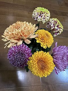 くすみカラーの大ぶりのマムが届きました。 少し気候と秋の方向に向いた中、ぴったりな秋色の趣きが気に入りました 明るいマムも好きですが、ザ菊よりな今回マムも素敵です! 花火のような花弁のマムもありました
