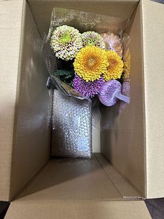 かわいい花束! カラフルで今までのイメージと違うマムでした。 一輪、花がとれてしまっており残念でした。