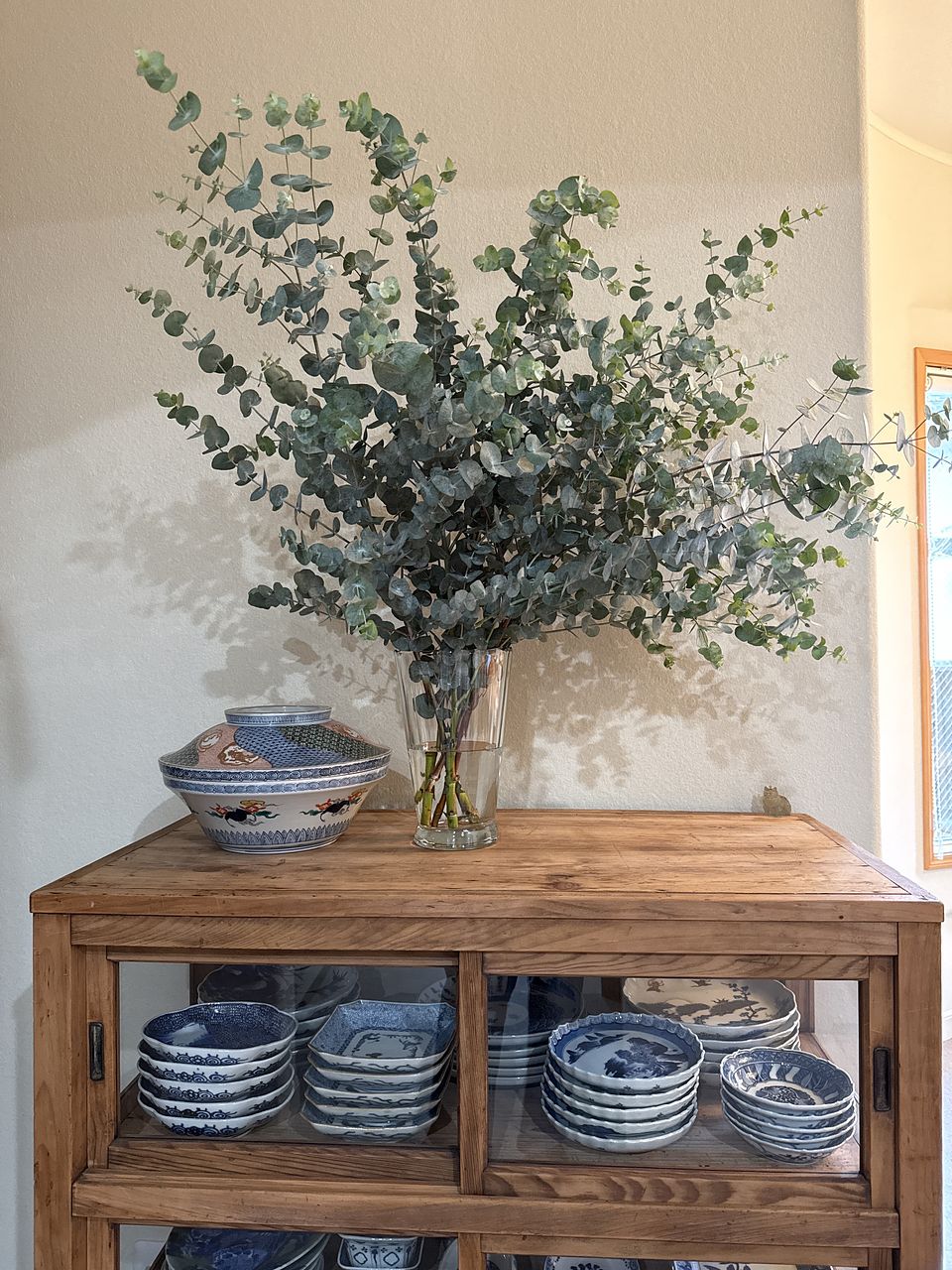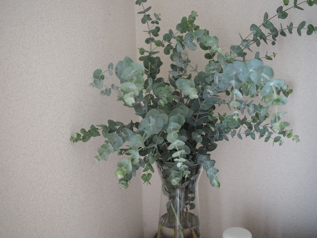 ボリューム満点で、いくつかに分けて生けました。近くを通るとほんのりユーカリの香りがして、うれしい気分になります。