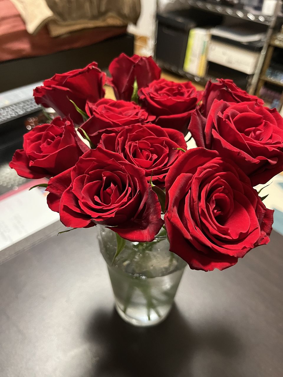 今回はベルベッドのように美しいバラ「サムライ」を10本束ねたシンプルなブーケをお届け。お得にたっぷりとお花をお楽しみいただけます。