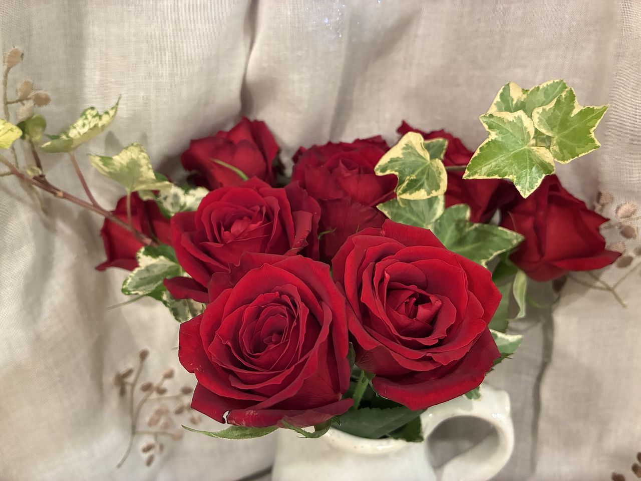 王道の真紅のバラ🌹、蕾のじょうたいで届き、これから少しずつ咲いていくのが、とても楽しみです。 10本入っていたので、7本と3本に分けて、2か所に飾れました。このバラは香りはほとんどしないです。