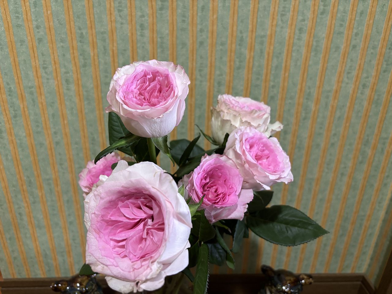 ひとまわりほど大きな美しいバラが届きました。華やかな可愛らしさに優雅なリラックスした心地良さを感じます🩷🤍いつも素敵なお花をありがとうございます🌿