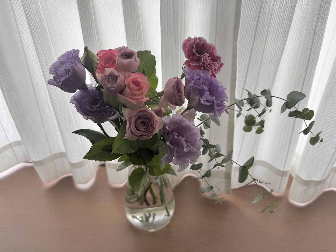 ラベンダーカラーのトルコキキョウにアンティークカラーのバラをたっぷりと束ねました😌