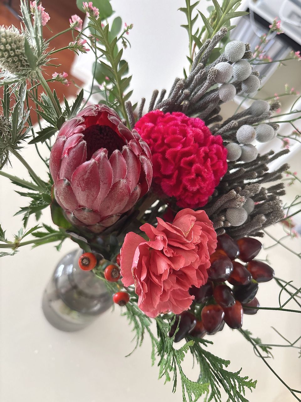 花材を少し足しましたが、何とかまとまったかな? プロテアを活けて見たかったから、嬉しい😃