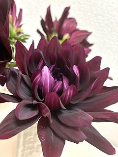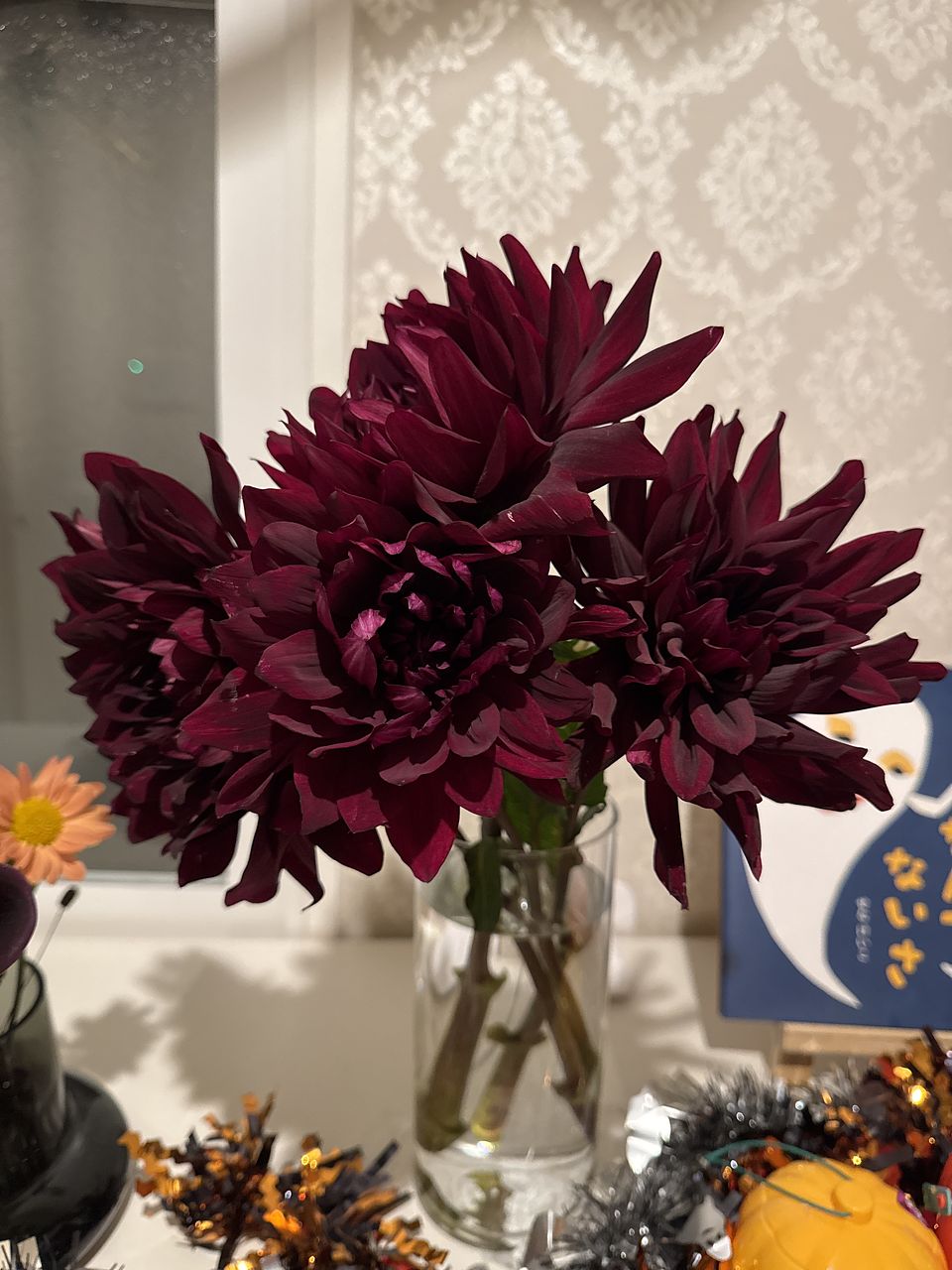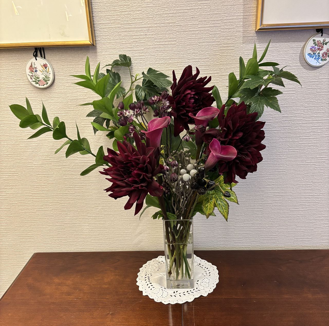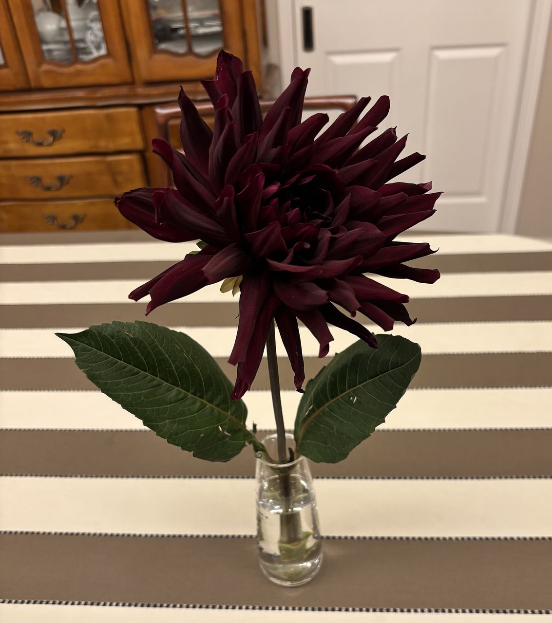 ダリア「黒蝶」、思っていたより大輪で立派でした。大人っぽくて、いい色‼️ちょうど家にあったアレンジと色がピッタリだったのて、3本はアレンジに追加し、1本は、一輪挿しにしました。