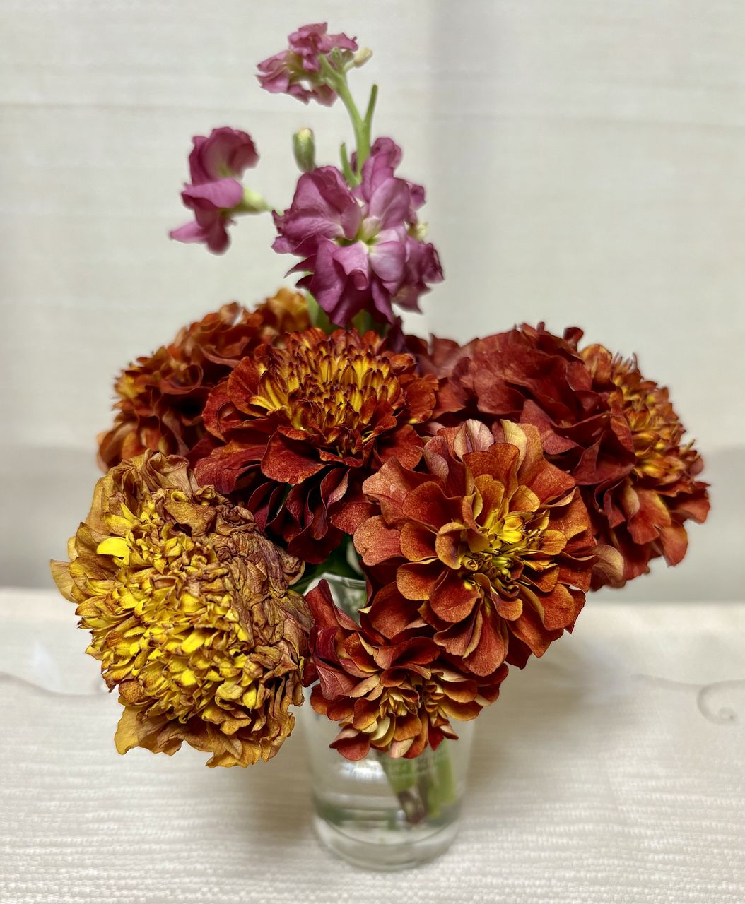 花びらがしなっていたりしてましたが、色合いは落ち着いた感じなのに華やかです。 折れてしまっていた花もあったのですが、小さく飾っています。