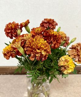 お花屋さんでは見たことがない秋色の綺麗な色のマリーゴールドでした。 葉っぱの先まで素敵な花束で幸せな気持ちです。 (写真は5本のうちの1本です)