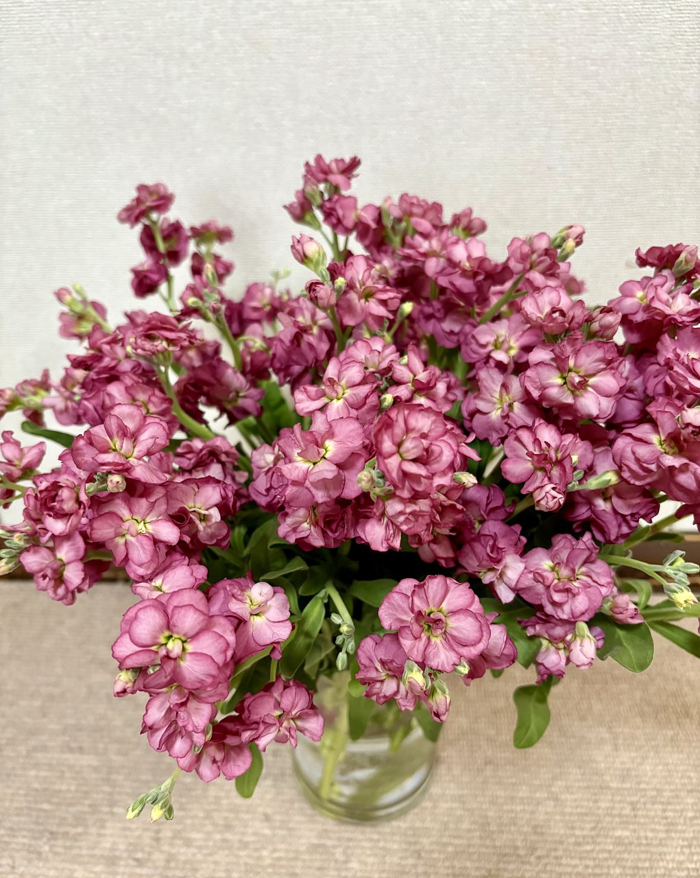 ストックの香りの成分はクローブ(丁子)のスパイシーさと、ほのかに甘いパウダリーな香りが混ざっています。ぜひ香りも楽しんでみて😉